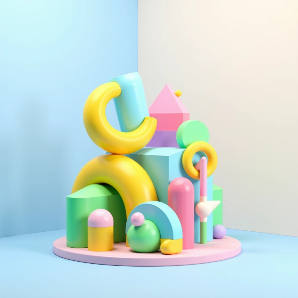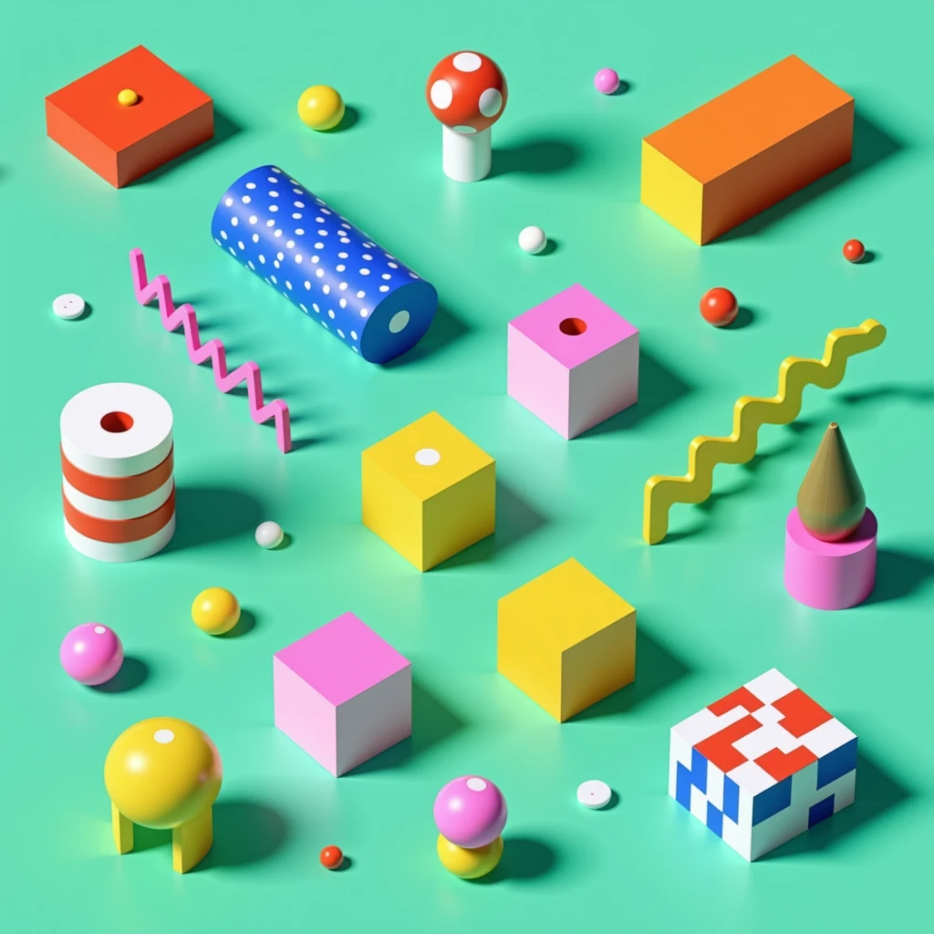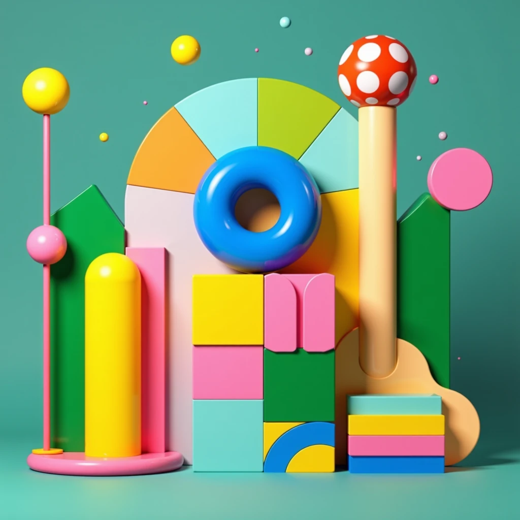 A contemporary 3D render take on the Memphis design style. Good for abstract 3D renders with soft edges and other almost claymation style scenes.