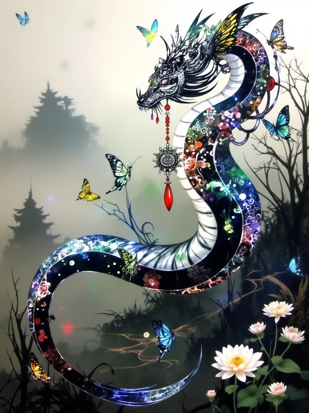 3.A white dragon is in the air. There are mountains behind the dragon. There is a large rock formation in front of the dragon that is covered in snow.