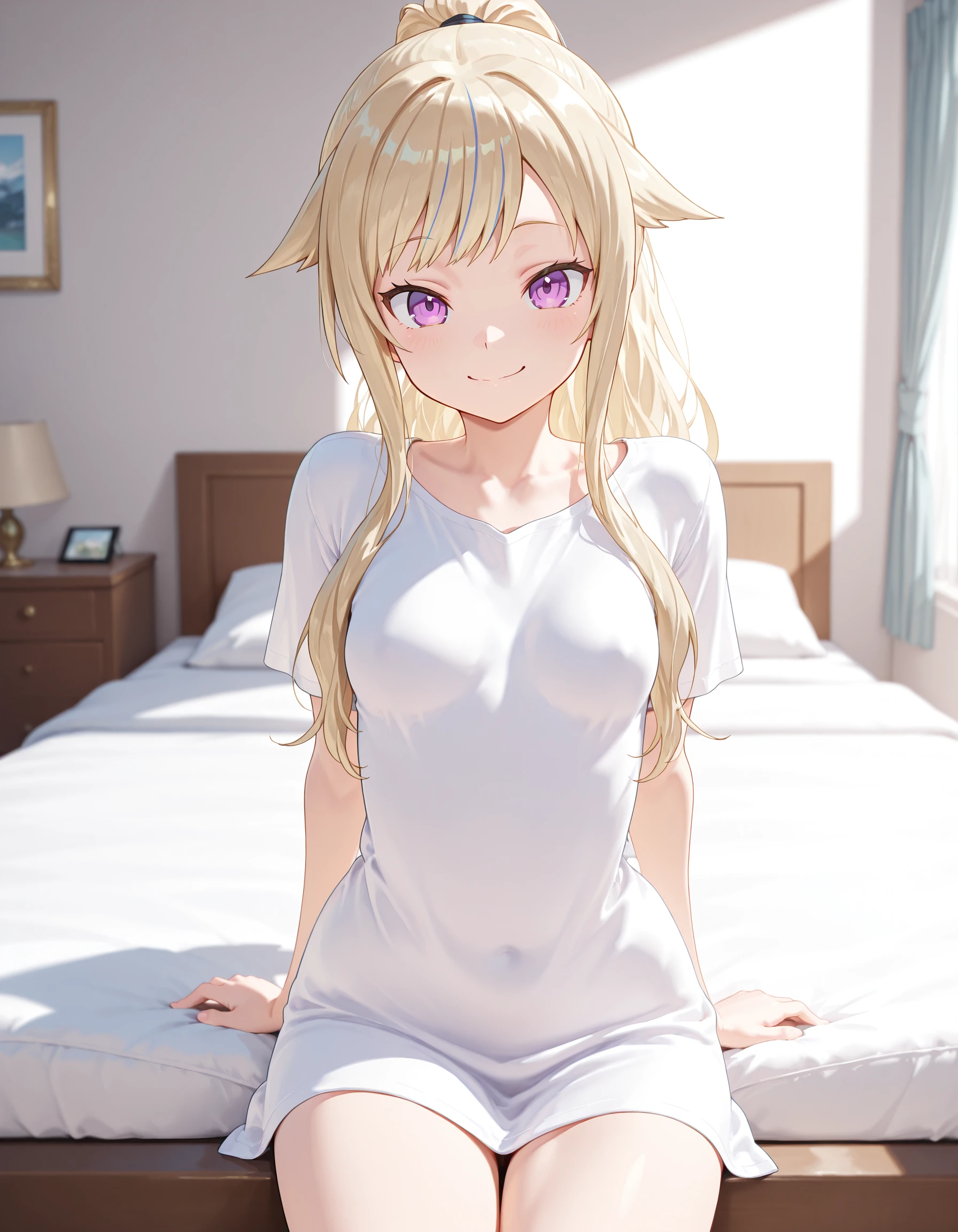 suzuki hina, blonde hair, long hair, streaked hair, hair flaps, purple eyes, skinny, small breasts, hat, beret, blue thighhighs, blue crop top, fingerless gloves, midriff, single thighhigh, sleeveless, suspender shorts, thigh straps, belt, pouch, armband, sash, bootsYou can also add her rarely-seen cape version outfit by including: