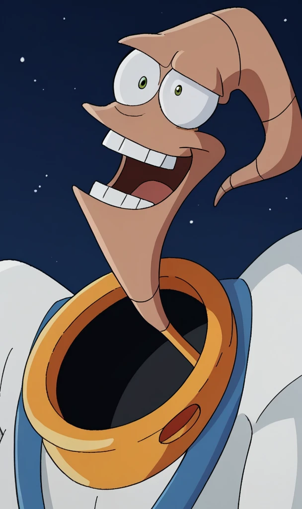 Then prompt something like: 'Cartoon Earthworm, big eyes, one green eye, no nose, happy expression, space suit, blue gloves, muscular'