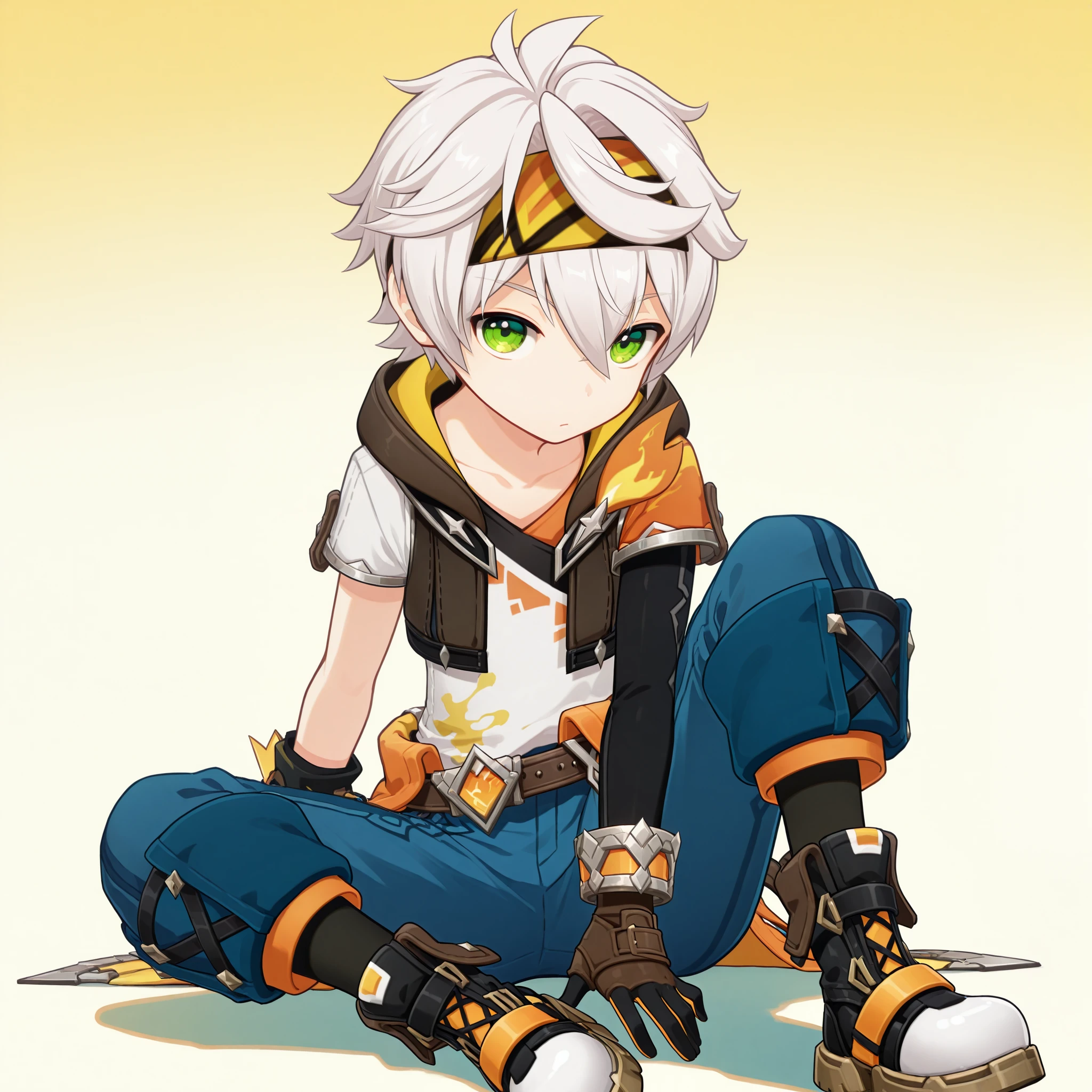 neoben,1boy,male focus,solo,short hair,white hair,headband,green eyes,hair between eyes,hoodie,multicolored jacket,shirt,white shirt,asymmetrical sleeves,short sleeves,bracelet,multicolored gloves,asymmetrical gloves,belt,clothes around waist,jewelry,blue pants,baggy pants,pouch,black socks,boots,multicolored footwear,