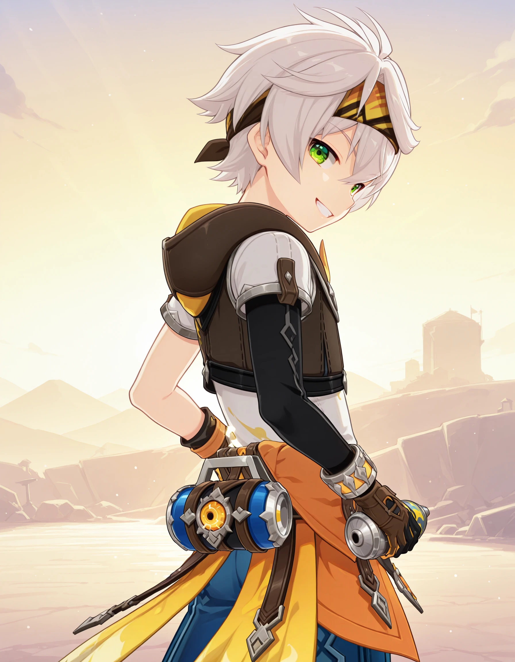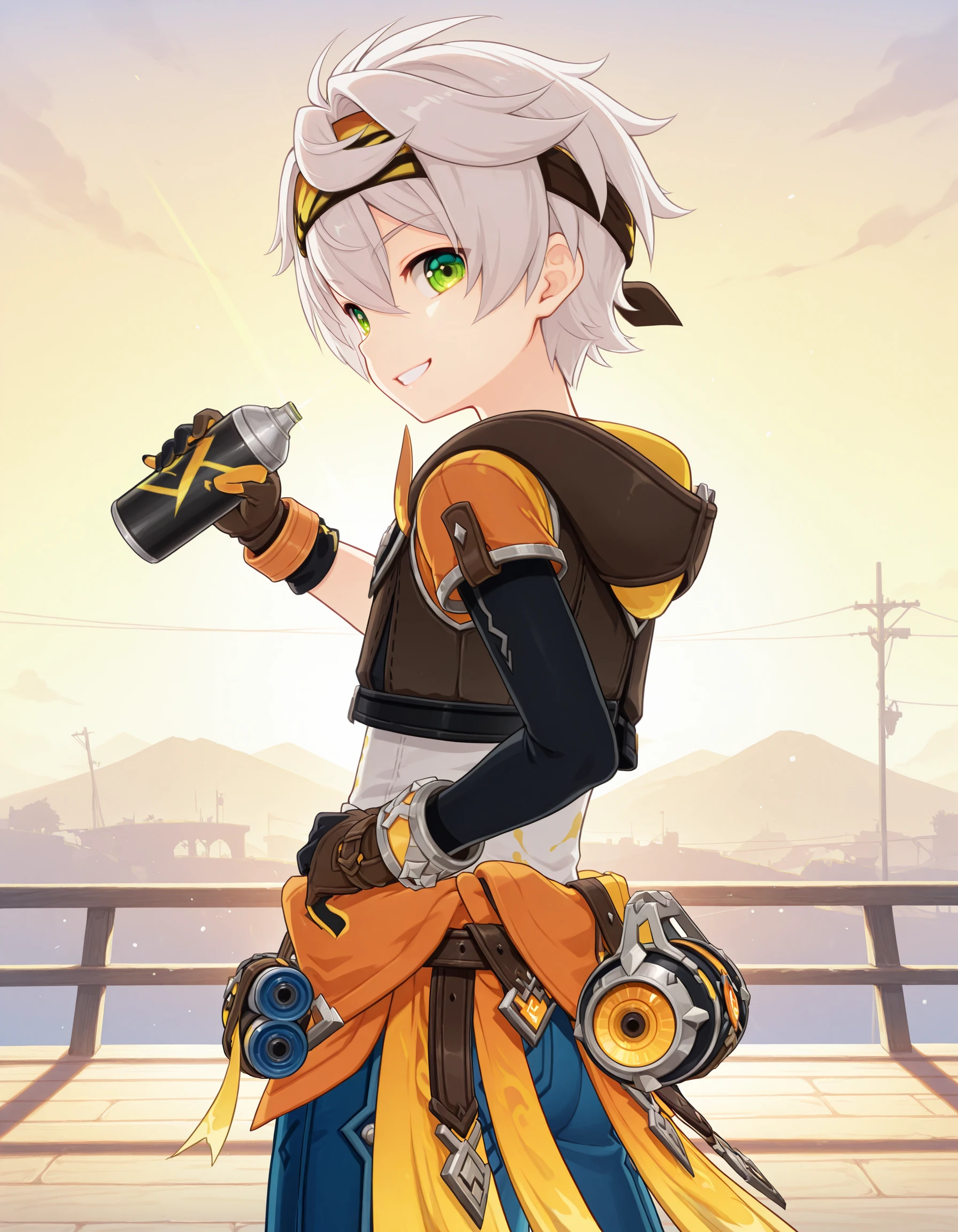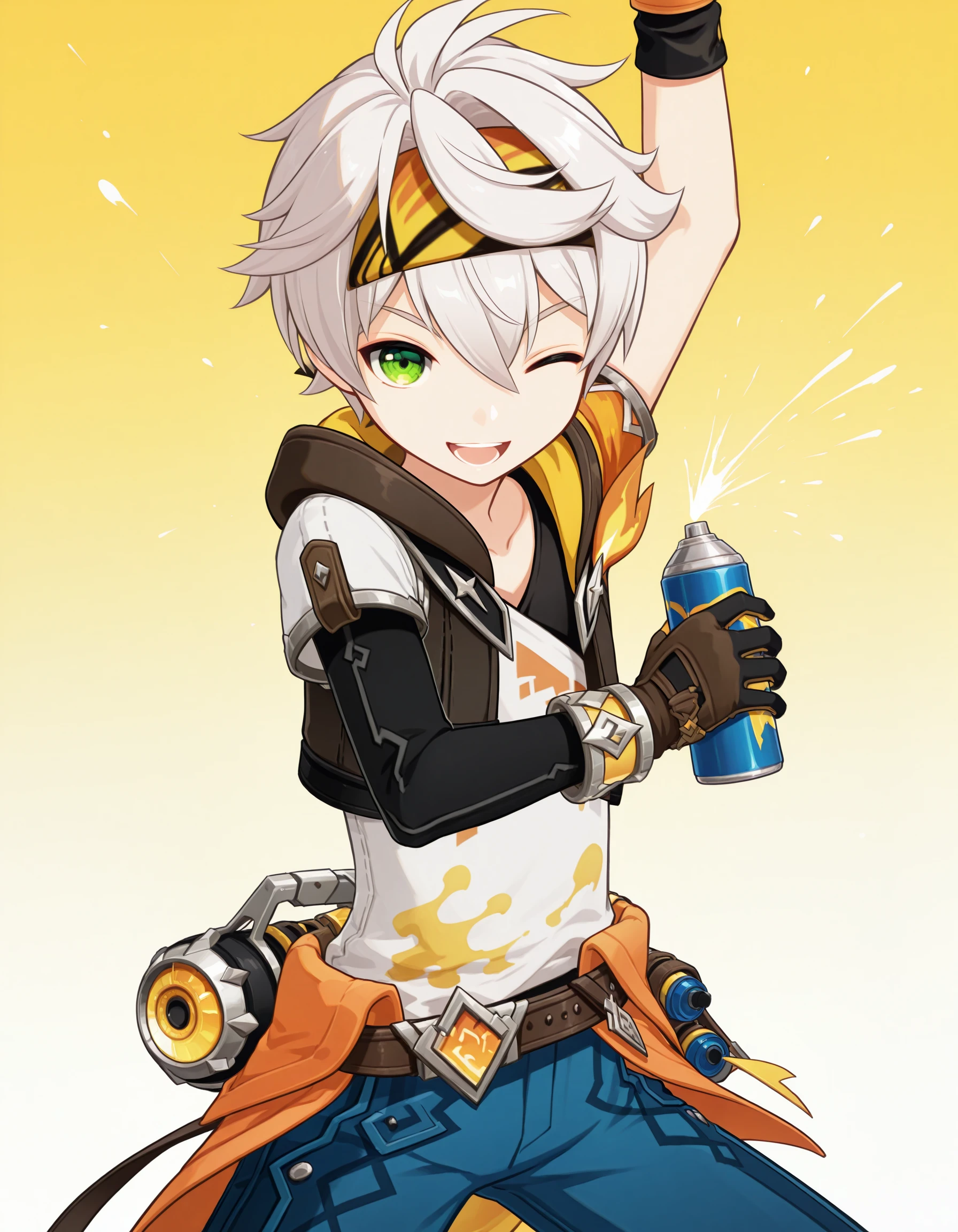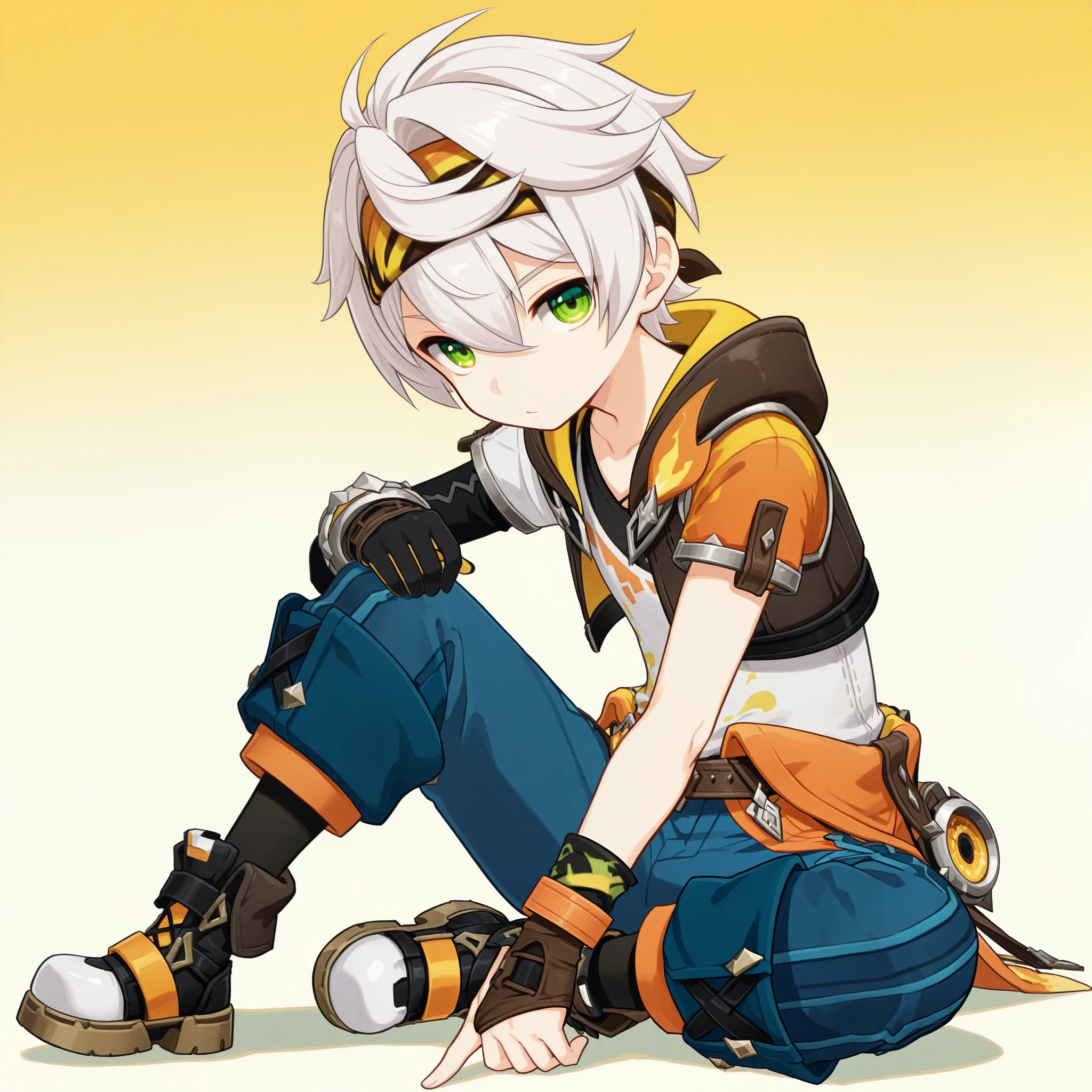 neoben,1boy,male focus,solo,short hair,white hair,headband,hair between eyes,green eyes,hoodie,jacket,hooded jacket,black jacket,shirt,white shirt,short sleeves,asymmetrical sleeves,bracelet,gloves,asymmetrical gloves,black gloves,brown gloves,fingerless gloves,belt,jewelry,pouch,orange clothes around waist,blue pants,baggy pants,black socks,shoes,multicolored footwear,