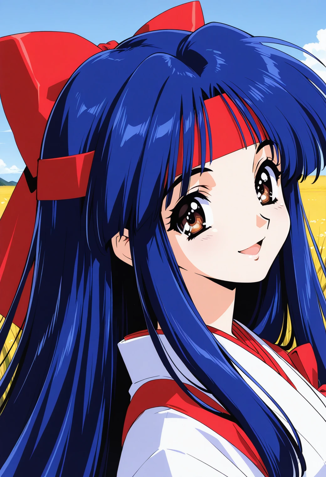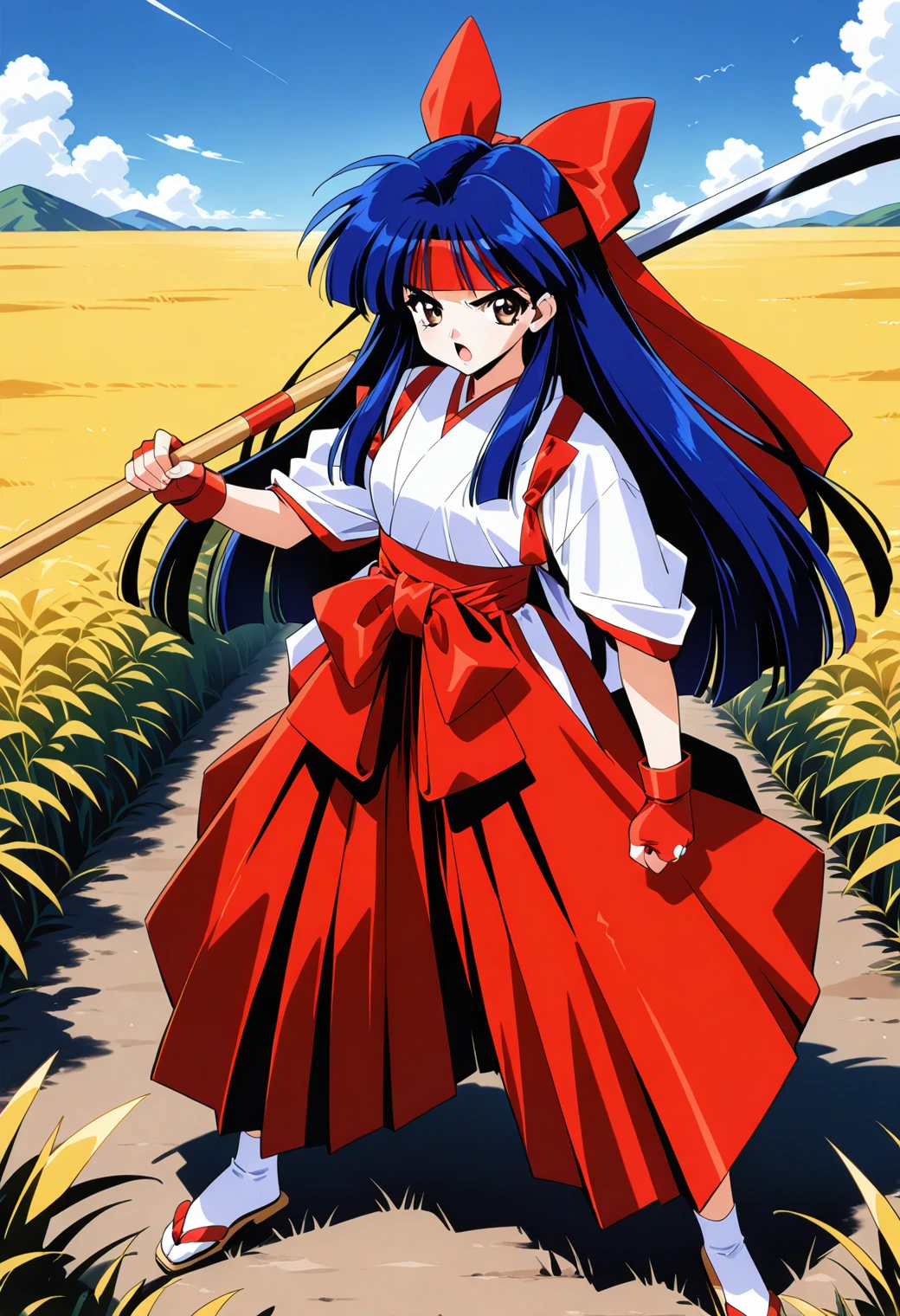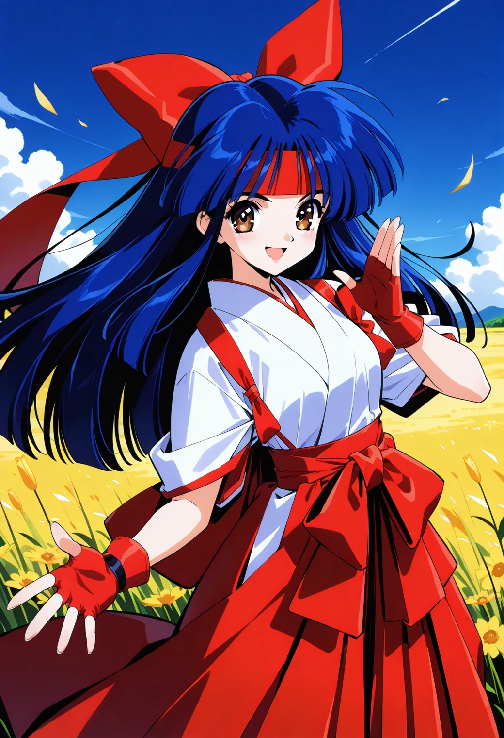 owada_nana, brown eyes, blue hair, long hair, hair bow, headband, red bow, japanese clothes, red hakama, red hakama skirt, red gloves, fingerless gloves, tasuki,