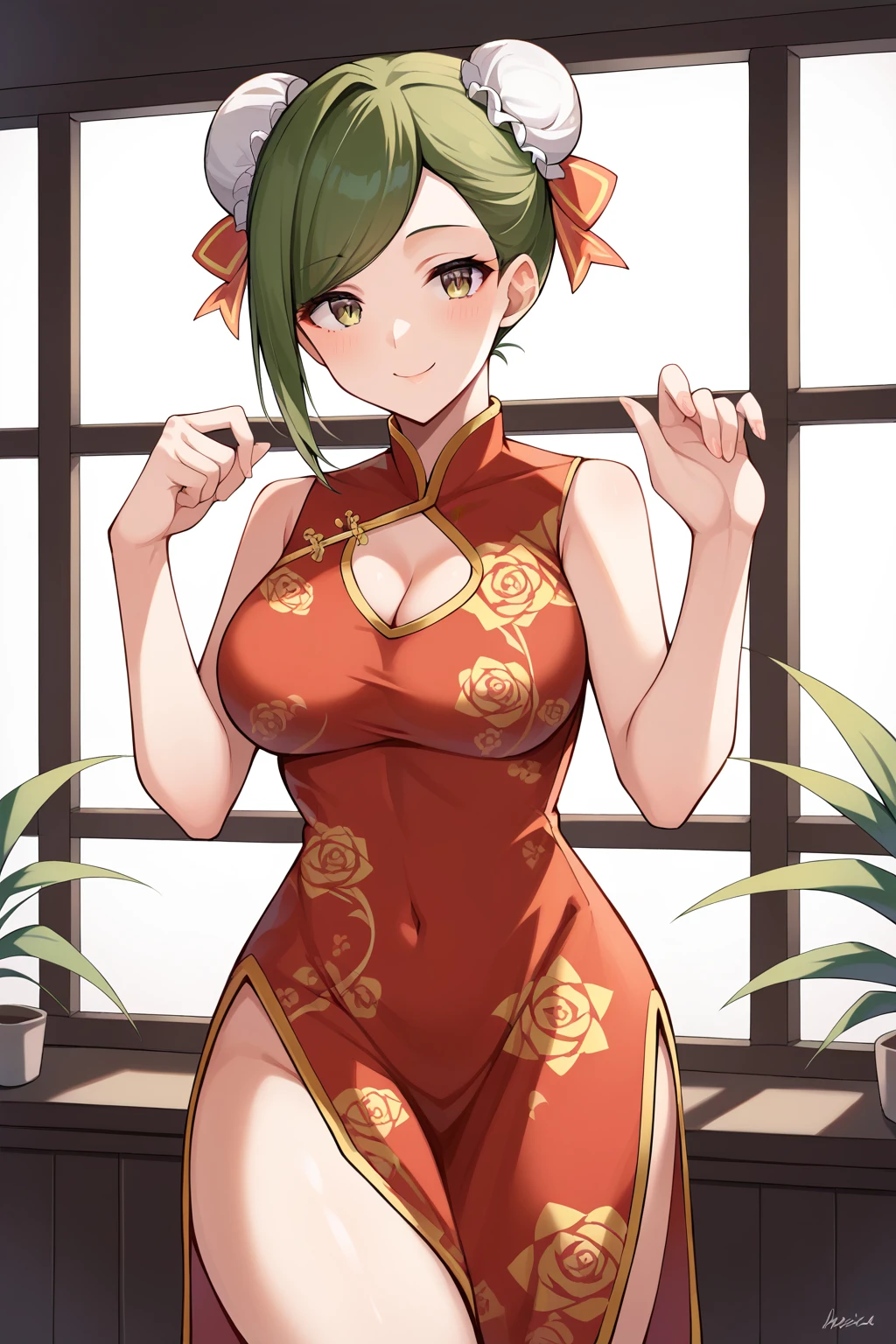 hazukinanakusa, 1girl, solo, green hair, short hair, hair bun, double bun, bun cover, swept bangs, green eyes, large breasts, chinese clothes, china dress, red dress, sleeveless, sleeveless dress, print dress, floral print, cleavage cutout, side slit