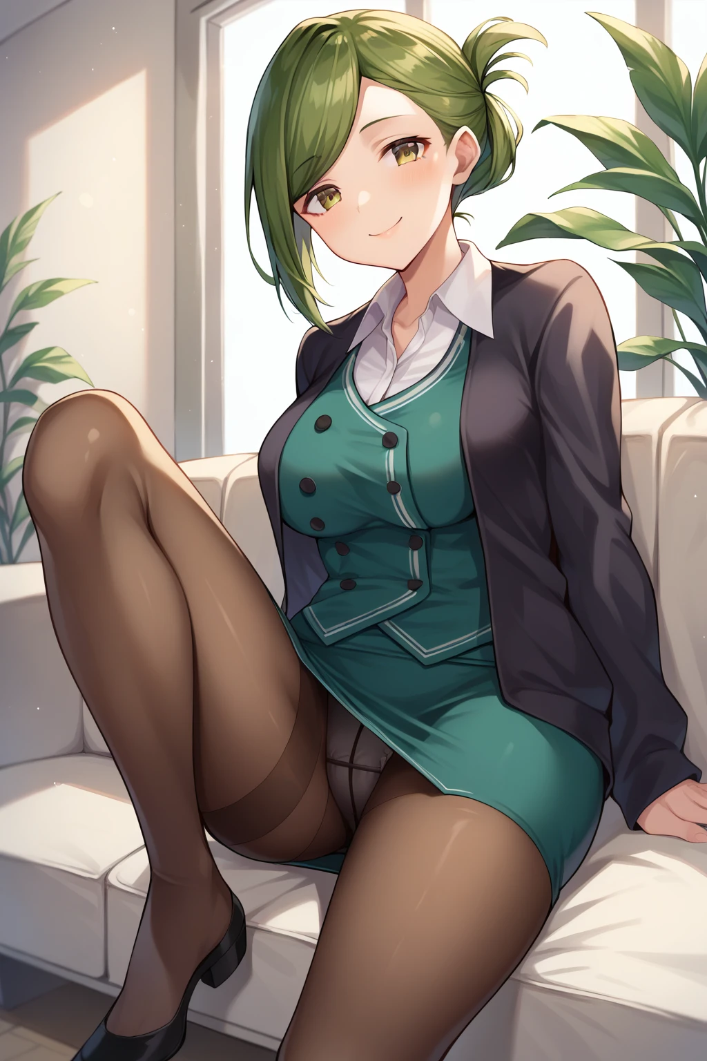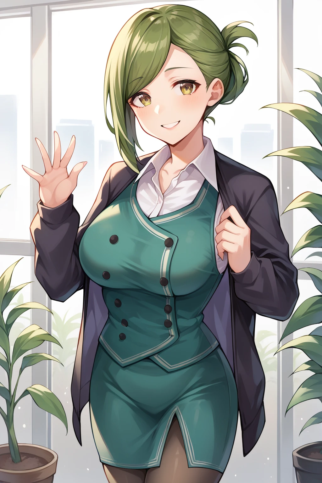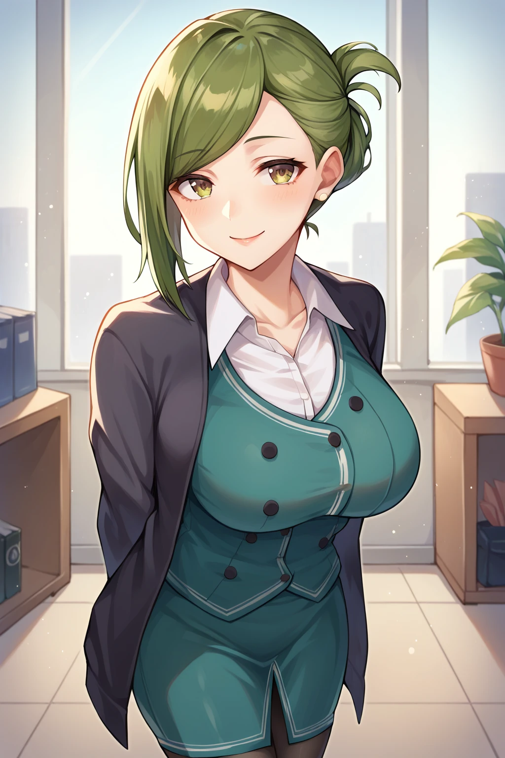 hazukinanakusa, 1girl, solo, green hair, folded ponytail, swept bangs, green eyes, large breasts, office lady, black jacket, open jacket, cardigan, open cardigan, white shirt, collared shirt, vest, green vest, green skirt, pencil skirt, black pantyhose