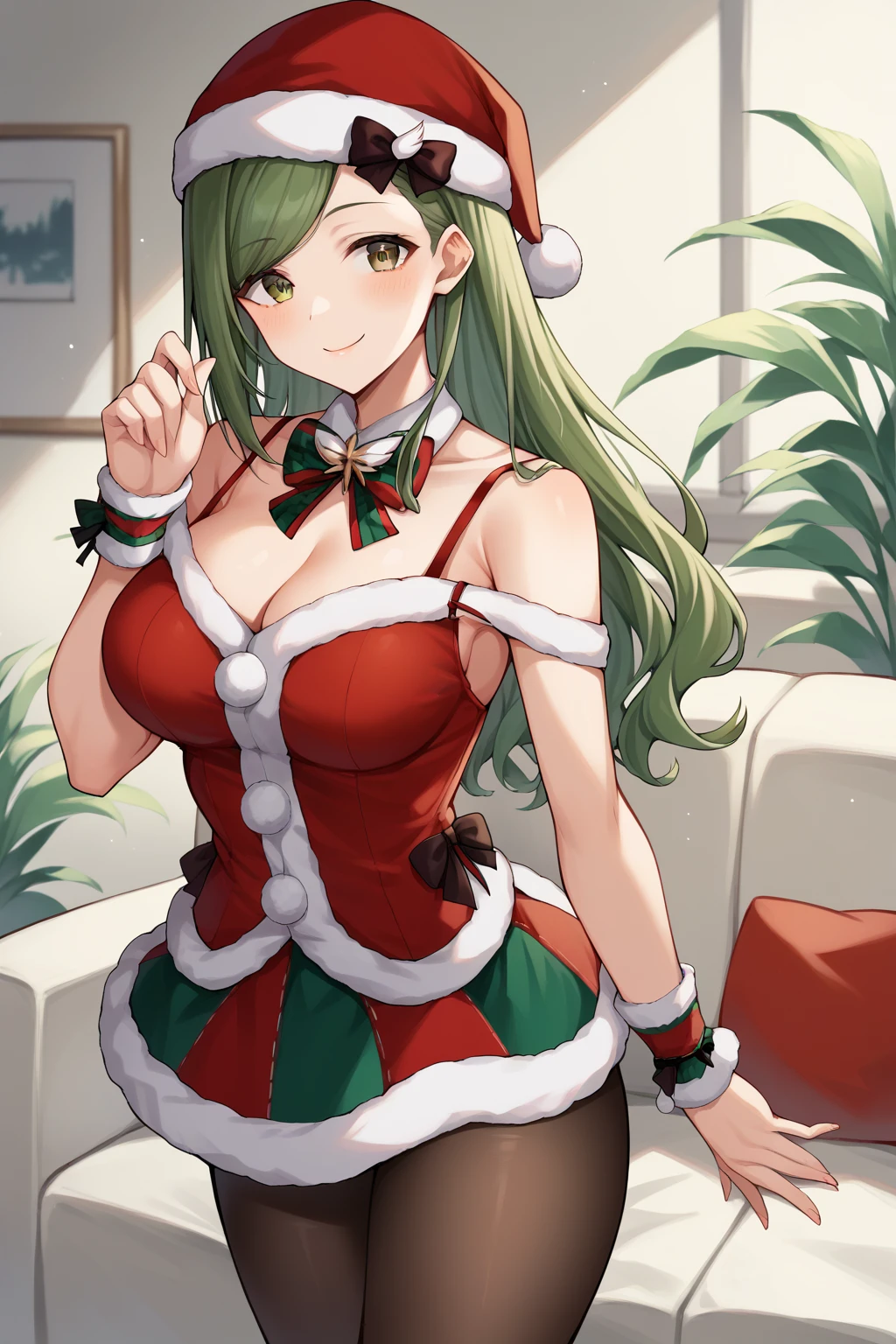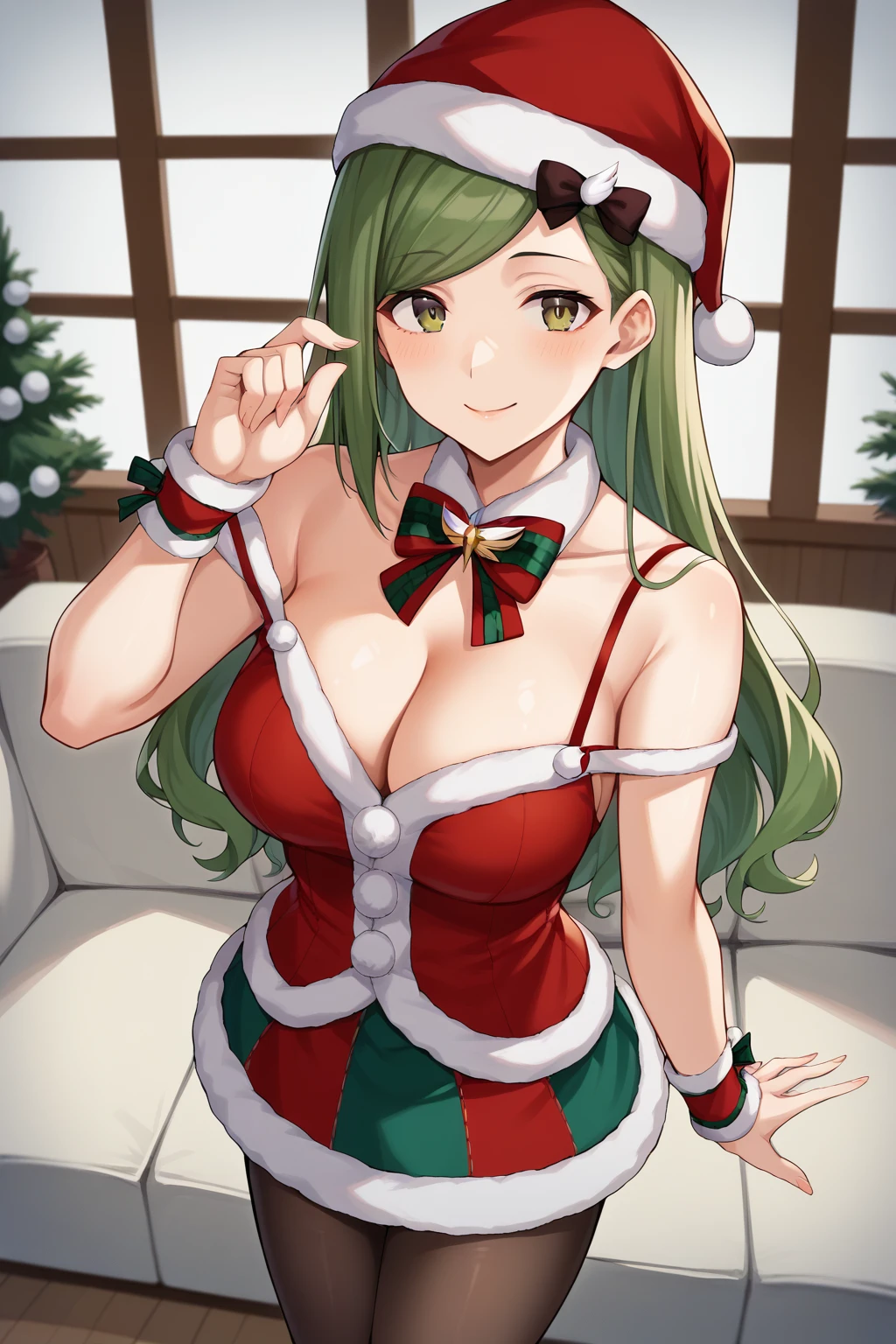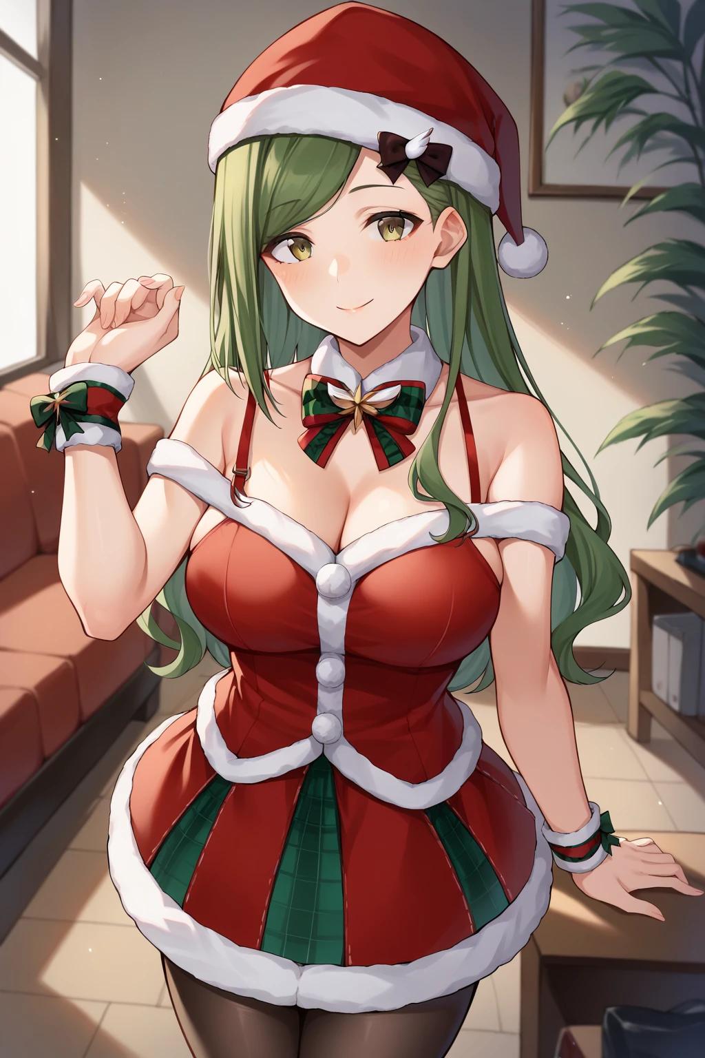 hazukinanakusa, 1girl, solo green hair, long hair, swept bangs, green eyes, large breasts, santa costume, santa hat, fur trim, bare shoulders, off shoulder, strap slip, red skirt, green skirt, multicolored skirt, red bowtie, green bowtie, multicolored bow, wrist cuffs, black pantyhose