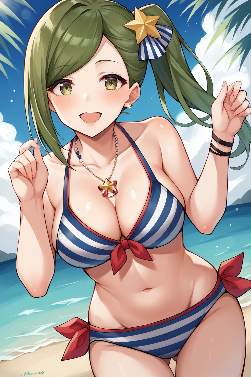 hazukinanakusa, 1girl, solo, green hair, long hair, side ponytail, swept bangs, green eyes, large breasts, hair ornament, hair bow, star \(symbol\), striped bow, necklace, bikini, striped bikini, front-tie top, side-tie bikini bottom