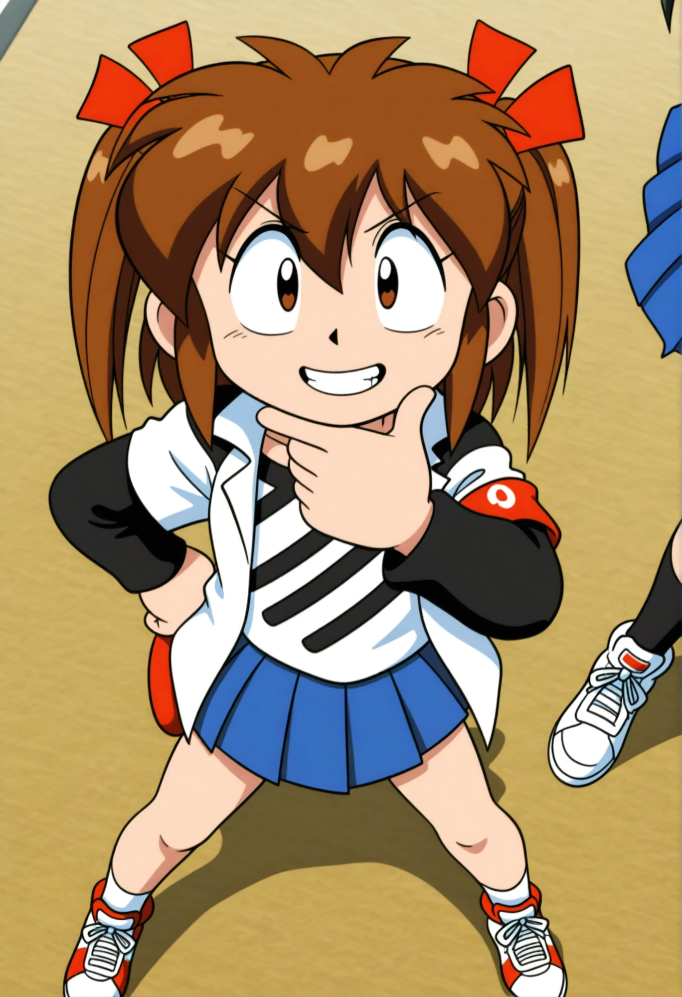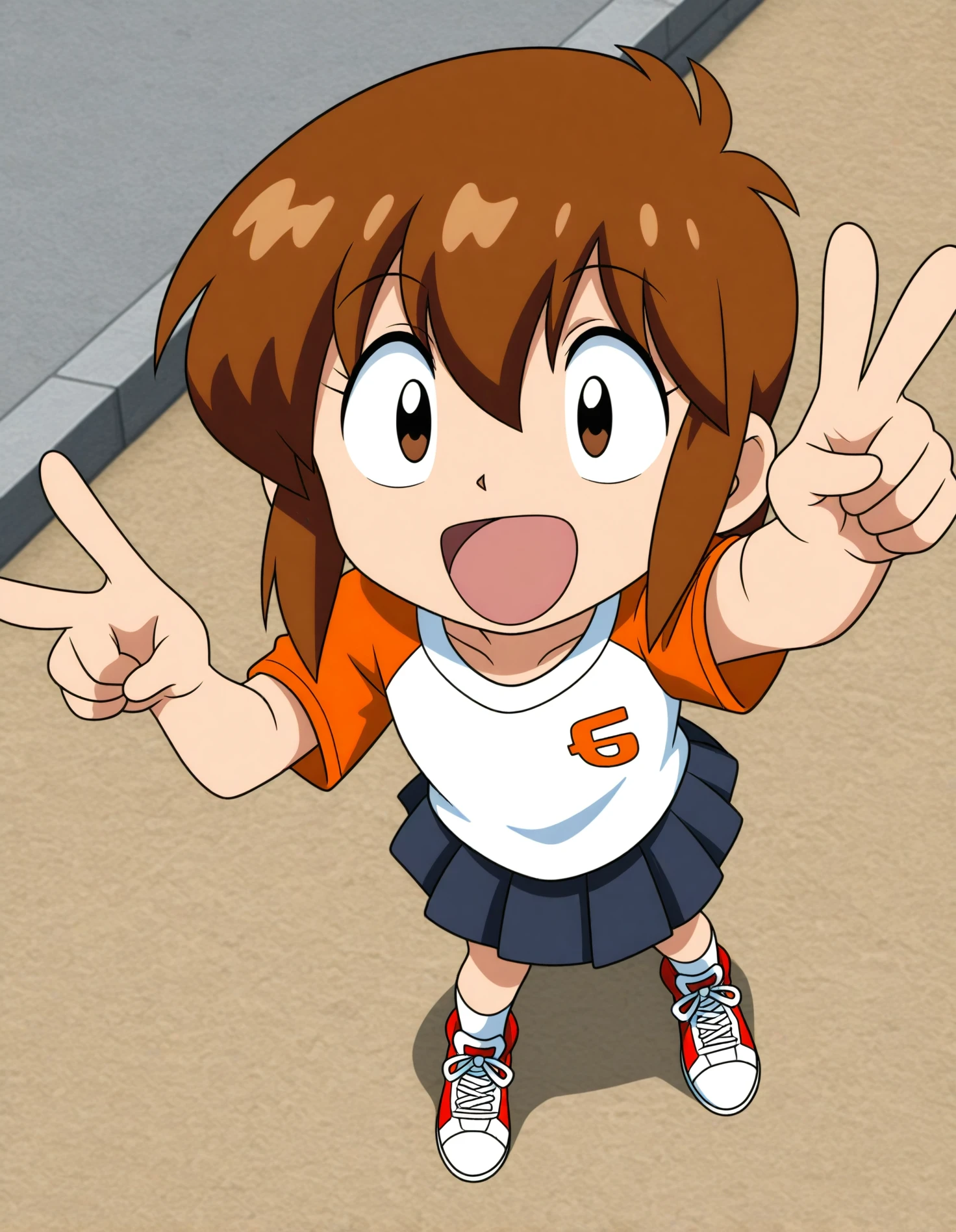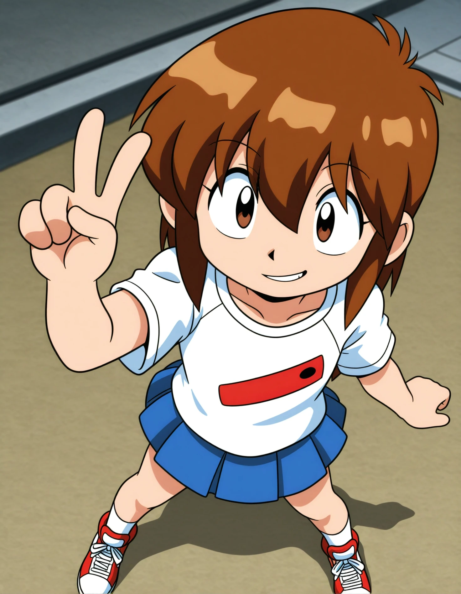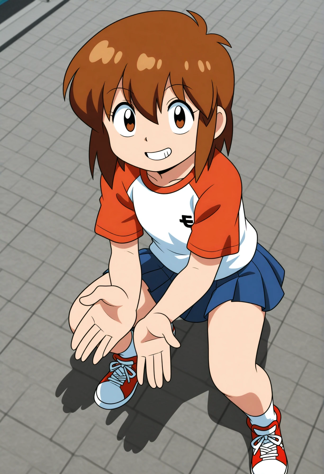 1girl,brown hair,short hair,hair between eyes,pleated skirt,shoes,socks,miniskirt,sneakers,t-shirt