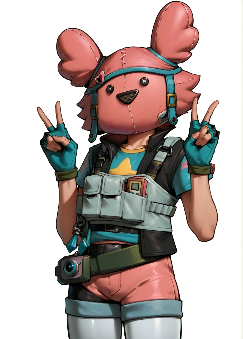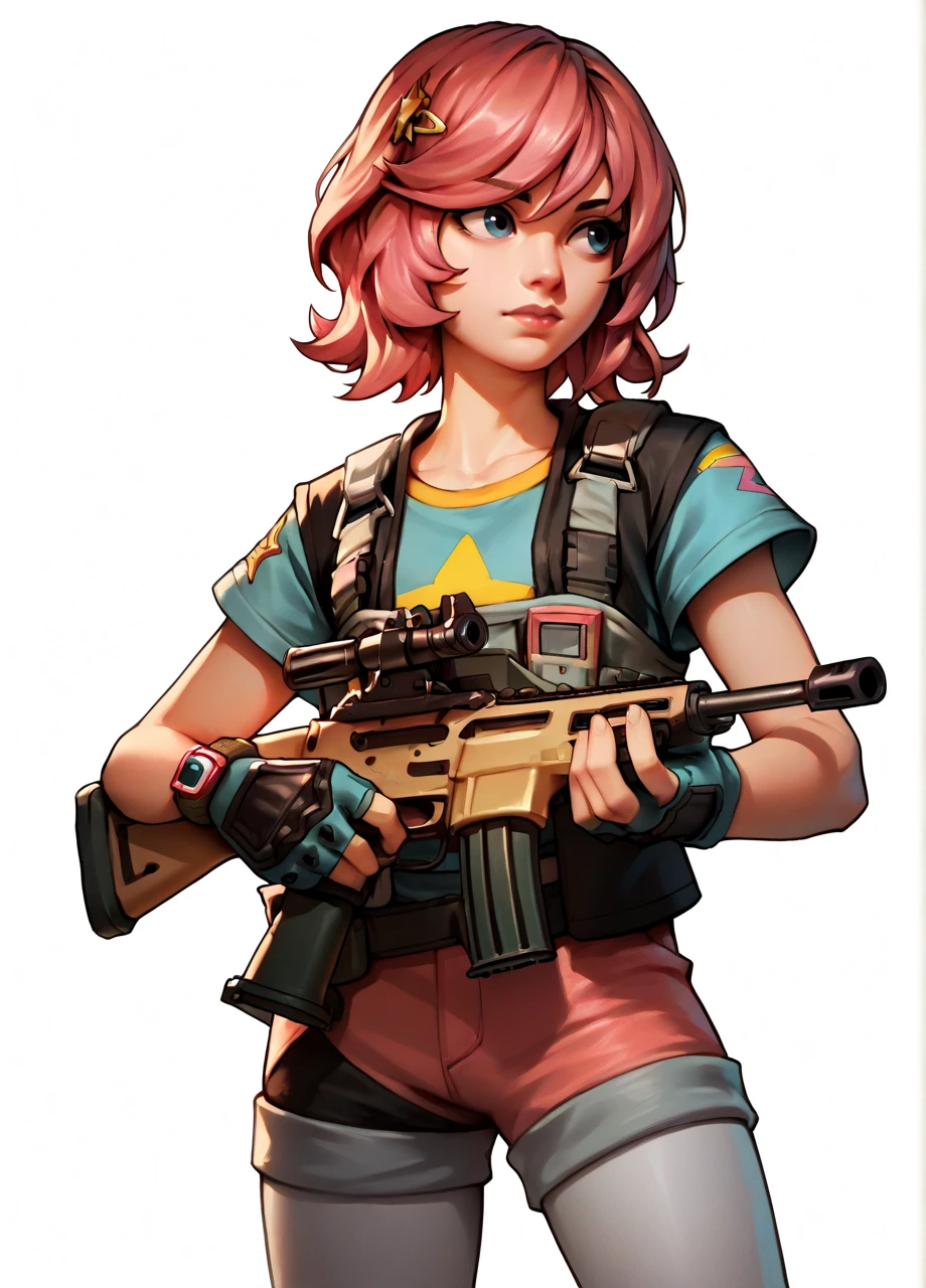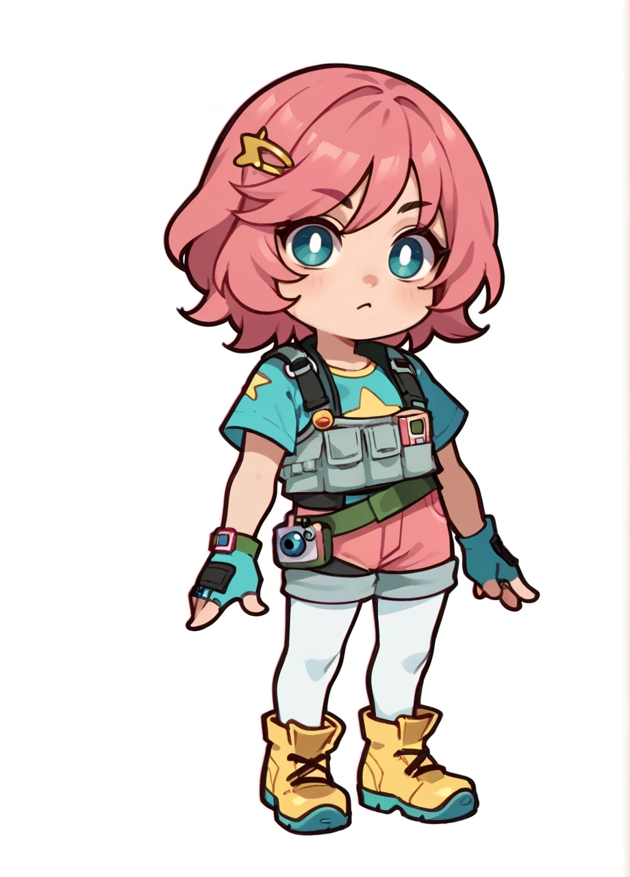 fnucskye, hairclip, t-shirt, fingerless gloves, bearer vest, belt, pink shorts, white leggings