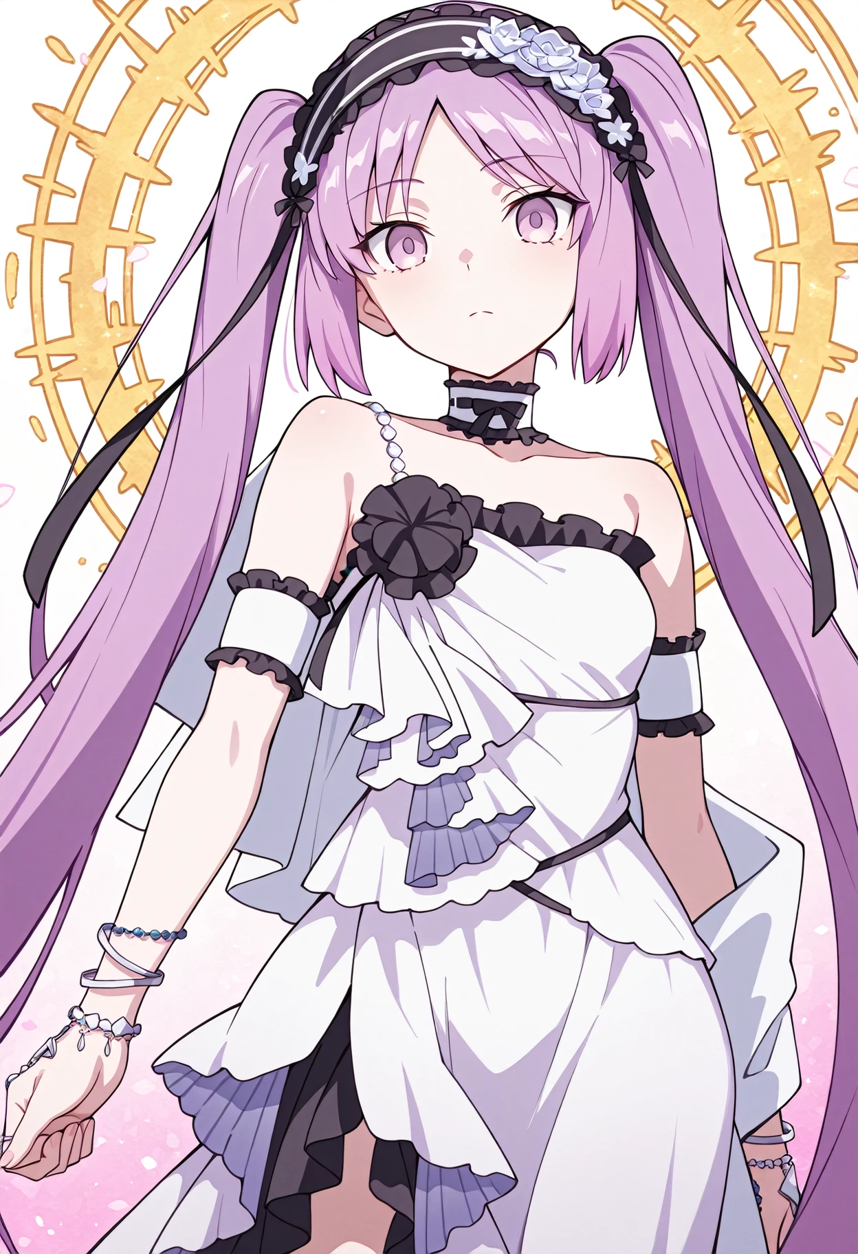 euryale \(fate\), hairband, purple hair, long hair, twintails, purple eyes, bare shoulders, white dress