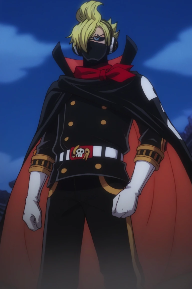 sanji_germa, blonde hair, sunglasses, mouth mask, headphones, red neckerchief, black suit