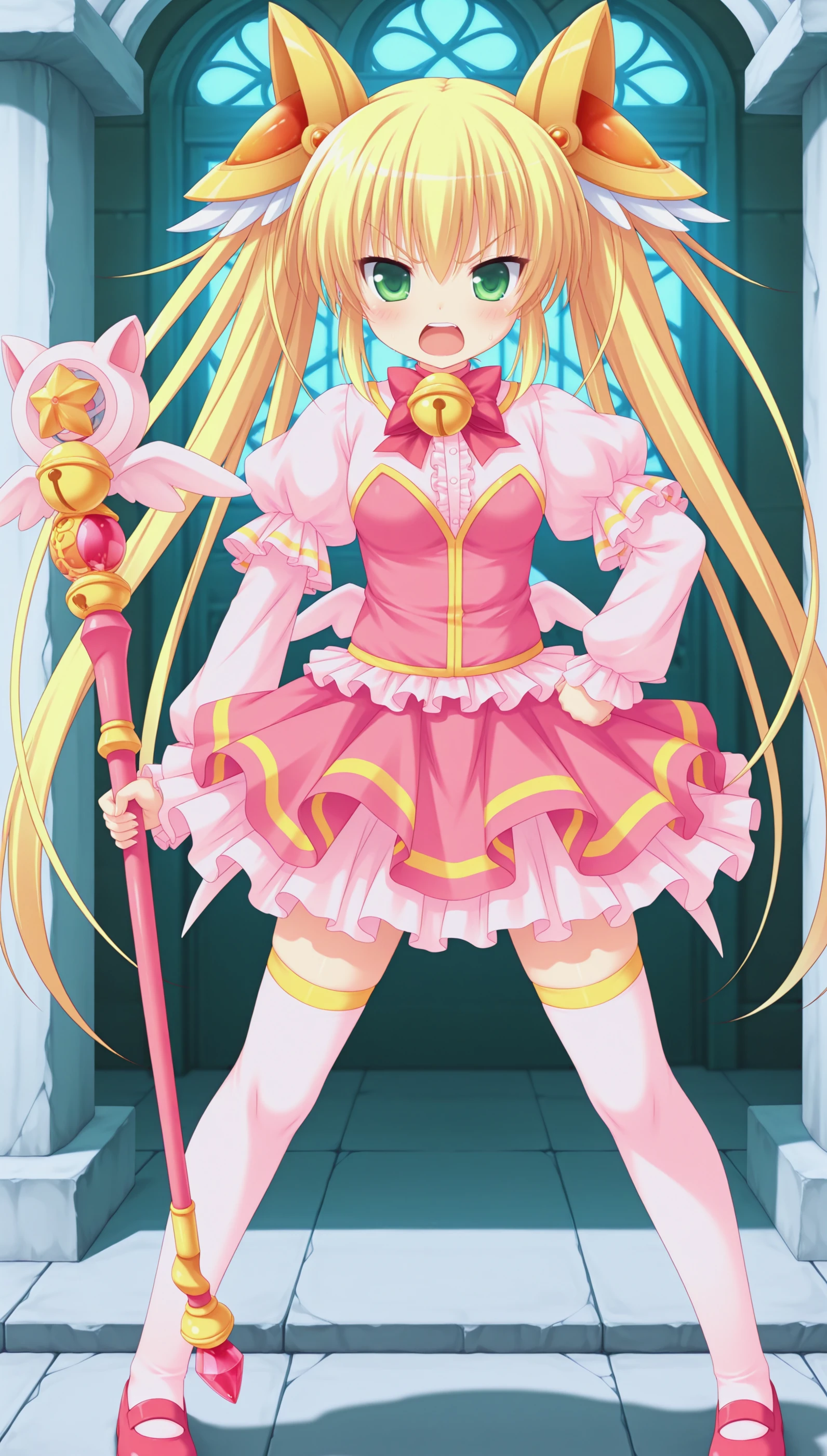 skirt, dress, bell, magical girl, staff, wand, white thighhighs, shoes