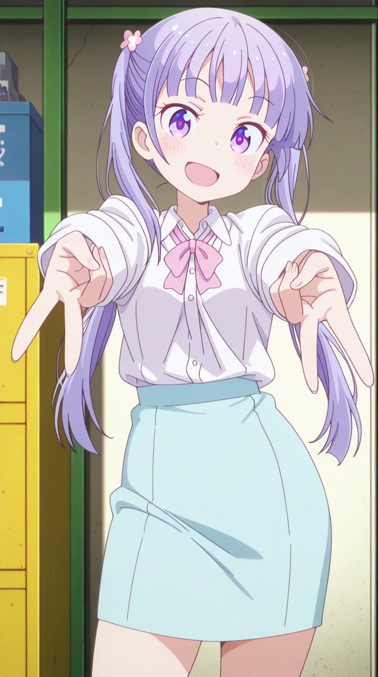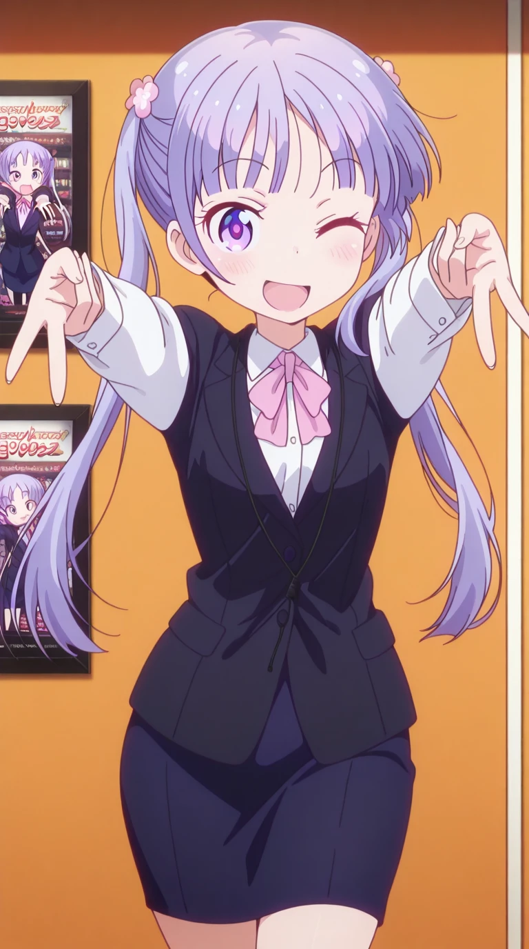 blue skirt, bow, bowtie, business suit, dress shirt, formal, neck ribbon, pink bow, pink bowtie, pink ribbon, ribbon, shirt, skirt, skirt suit, suit, white shirt,