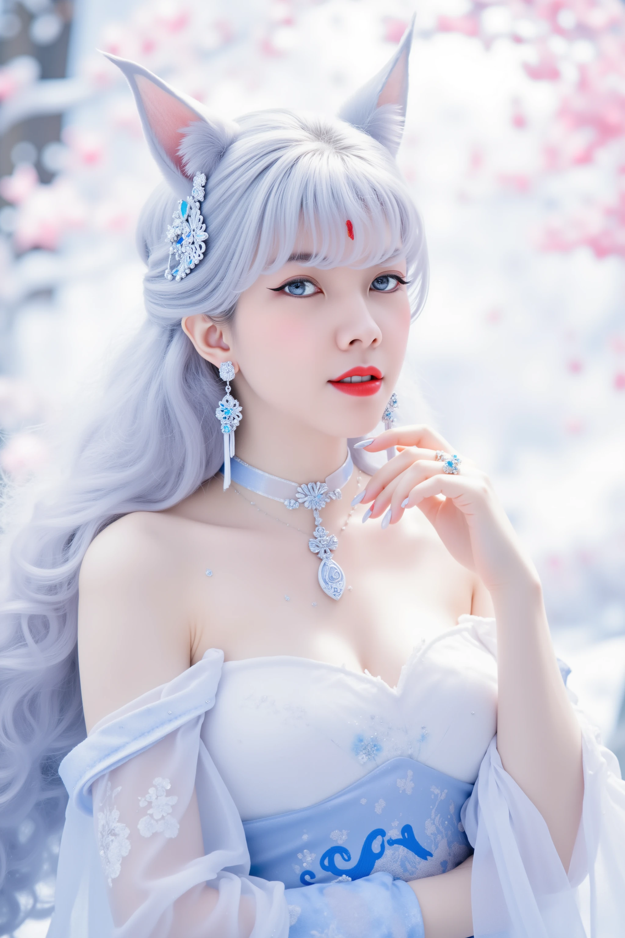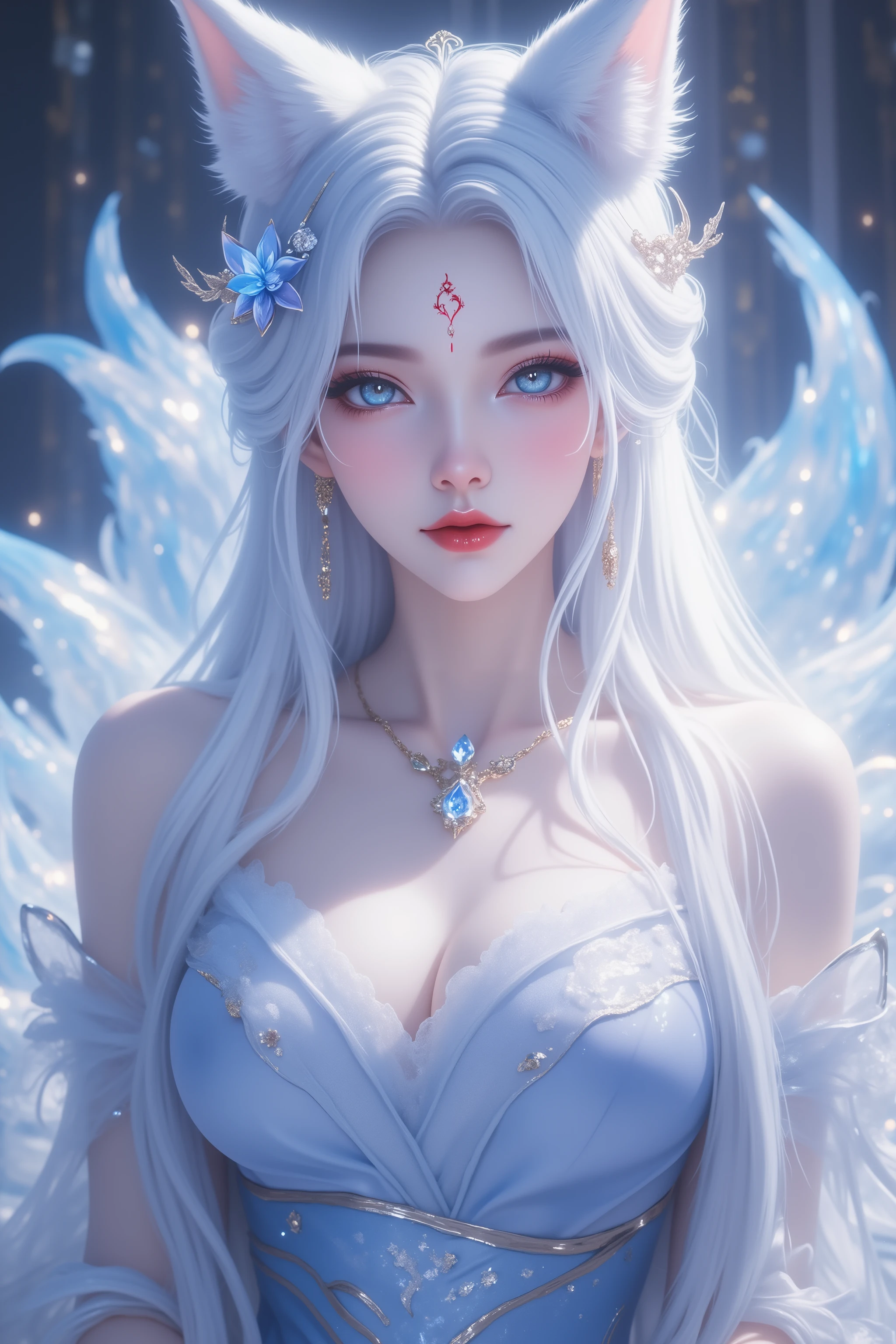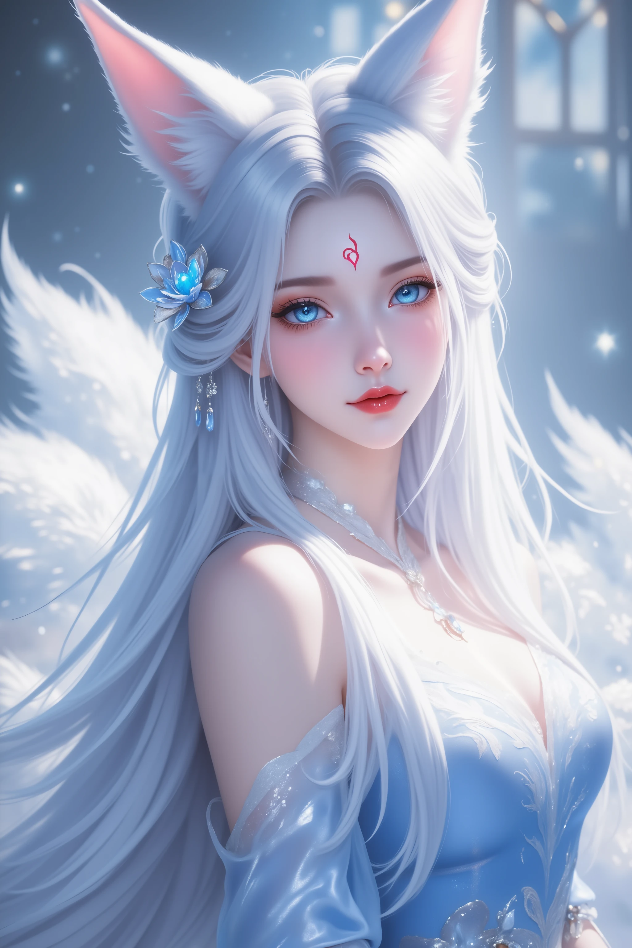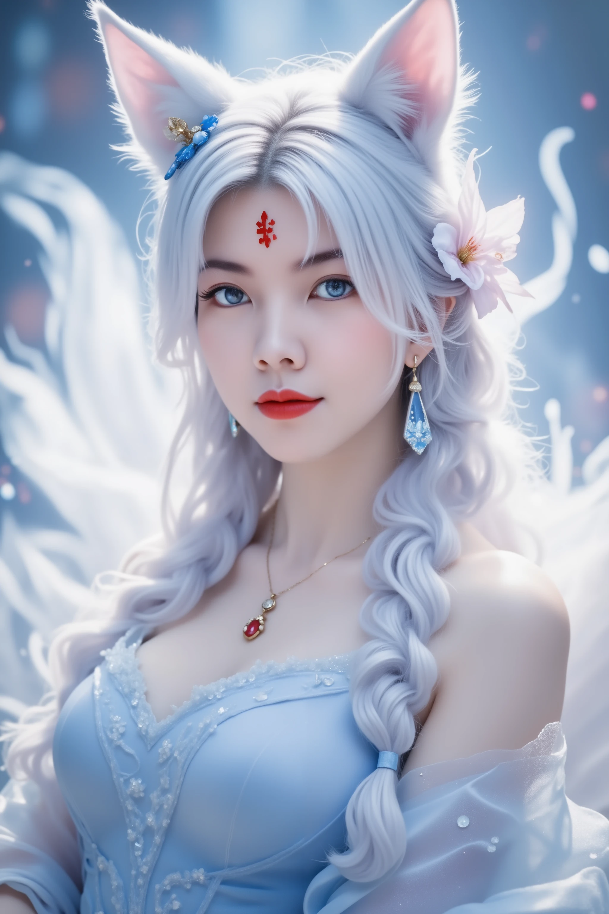 Xiao bai, Create a fantasy-inspired portrait of a mystical female character with long, flowing white hair and fox-like ears. Her large, blue eyes are captivating, and her expression is calm yet enigmatic. She has a red magical symbol on her forehead, adding to her otherworldly aura. She is dressed in an elegant, shimmering light blue gown with delicate, translucent sleeves. Her hair is styled in a loose braid with a few strands framing her face, and a decorative flower adorns her hair. The background is ethereal and softly lit, with an aura of mystery and magic, enhanced by the soft glow surrounding her, giving the impression of a celestial or supernatural being.