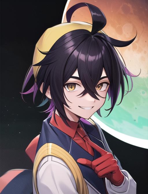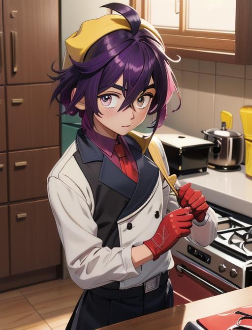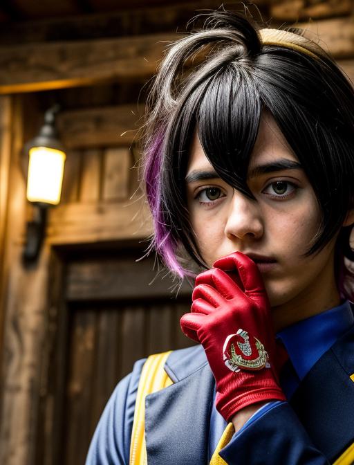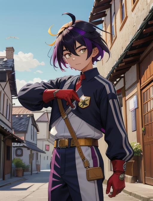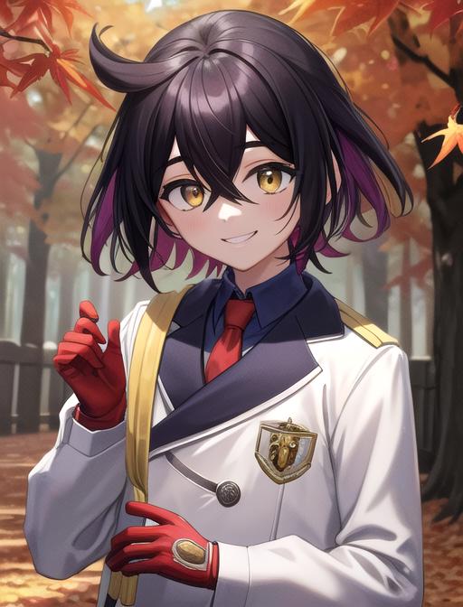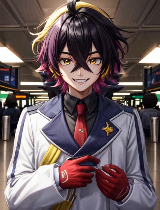 Additional words that may help: 1boy, black hair, two-toned hair, purple hair, yellow hair, red gloves, uniform