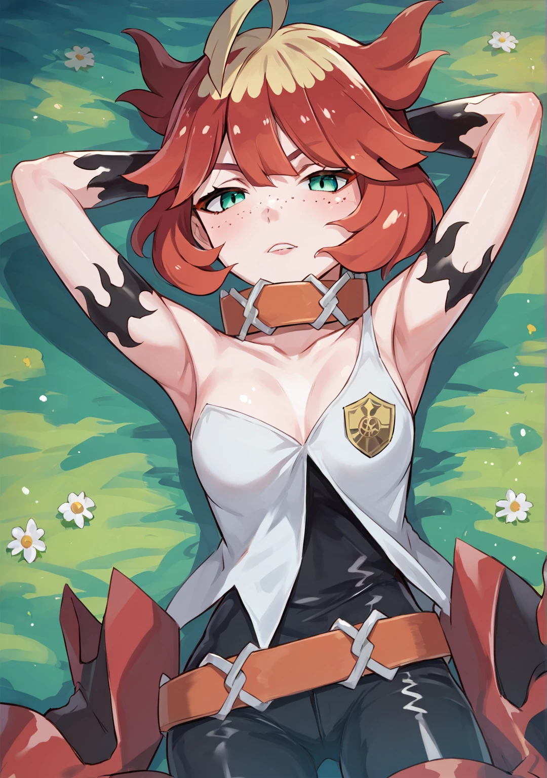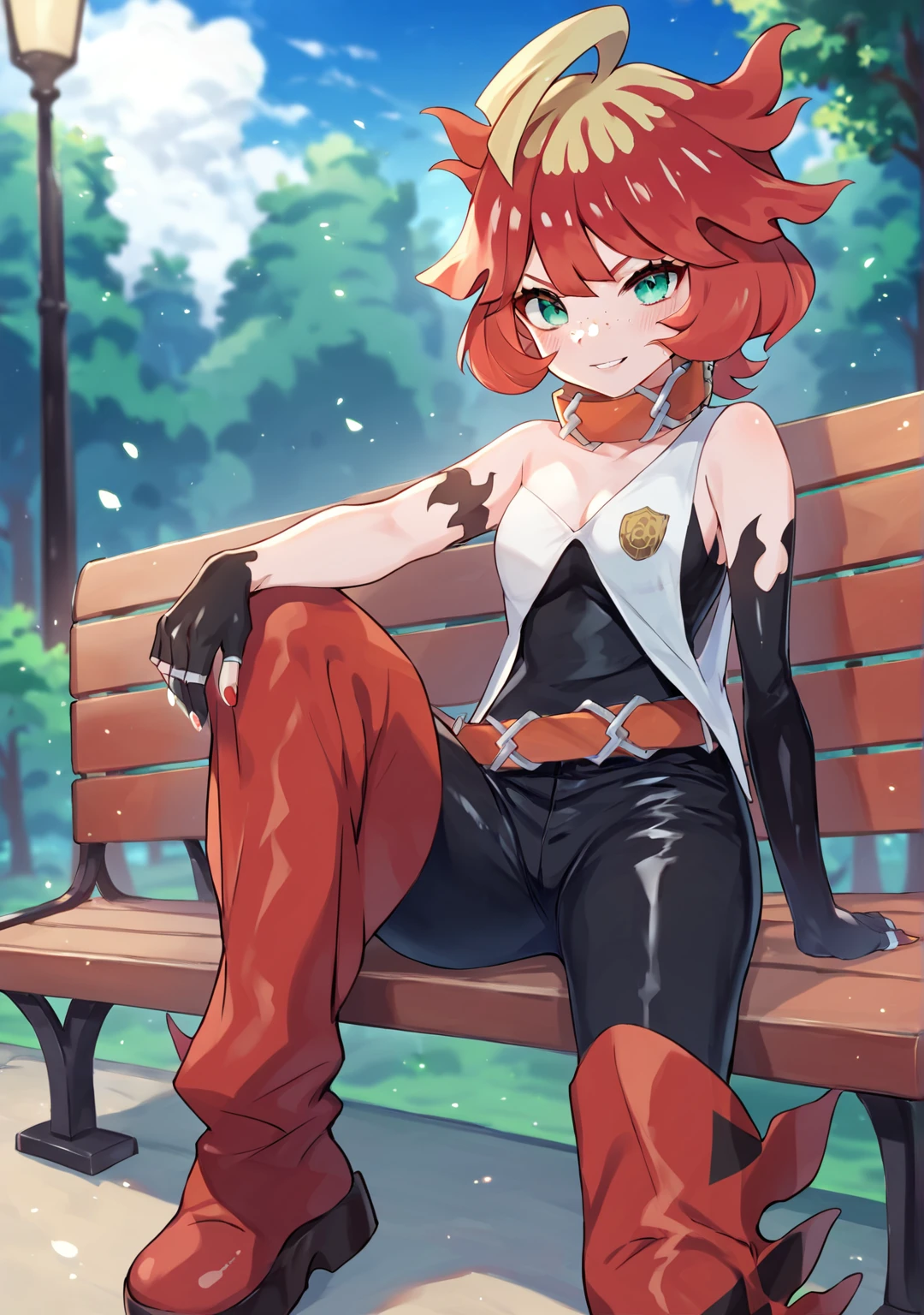 1girl, solo, mela (pokemon), multicolored hair, red hair, blonde hair, green eyes, freckles, collar, gloves, black bodysuit, red footwear,Description