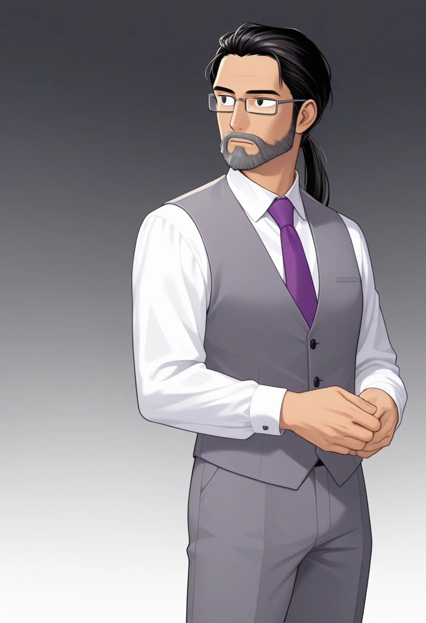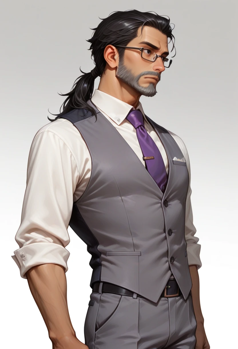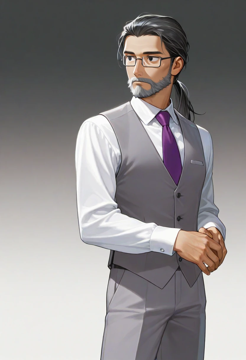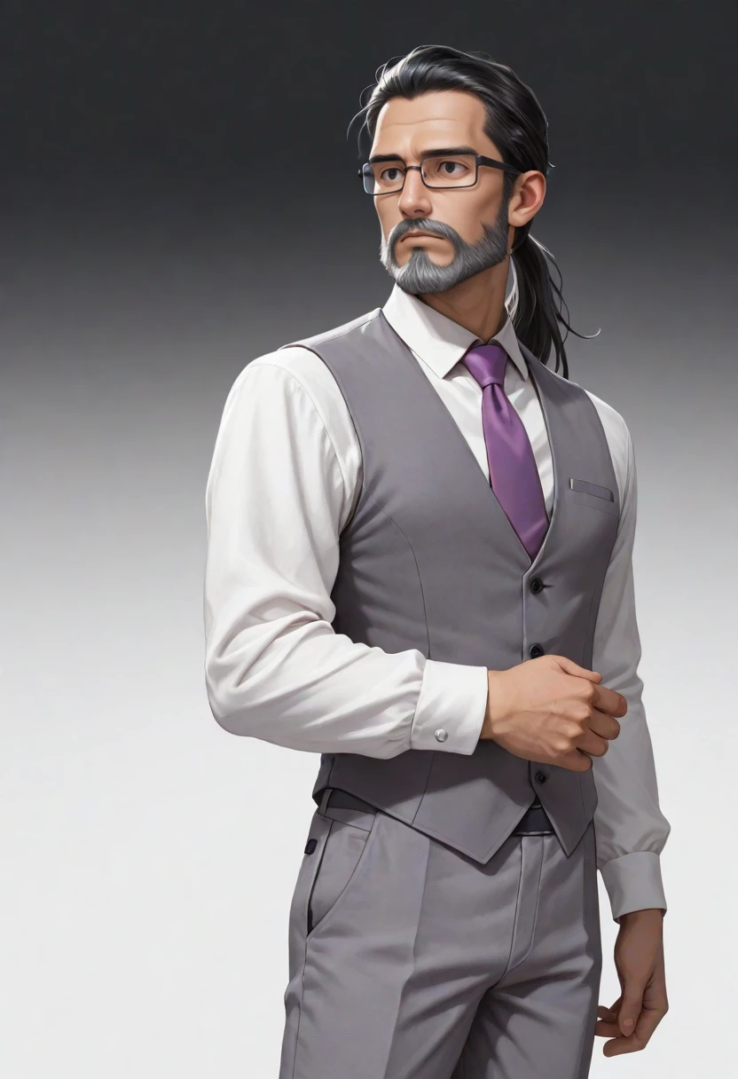 long hair, ponytail, black hair, grey beard, facial hair, rectangular glasses, black hair, black eyes, 30 years old, white shirt, grey waistcoat, purple tie, grey pantsDescription