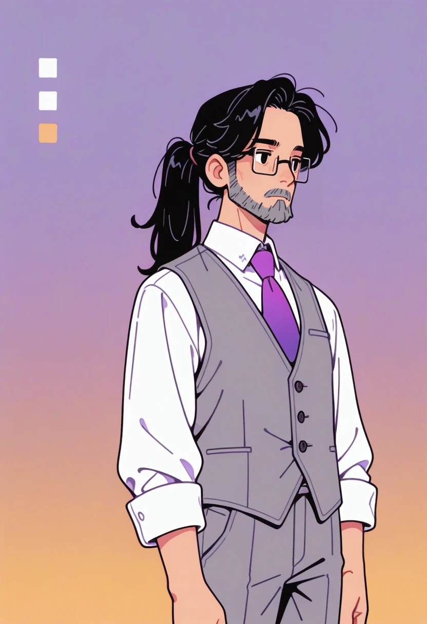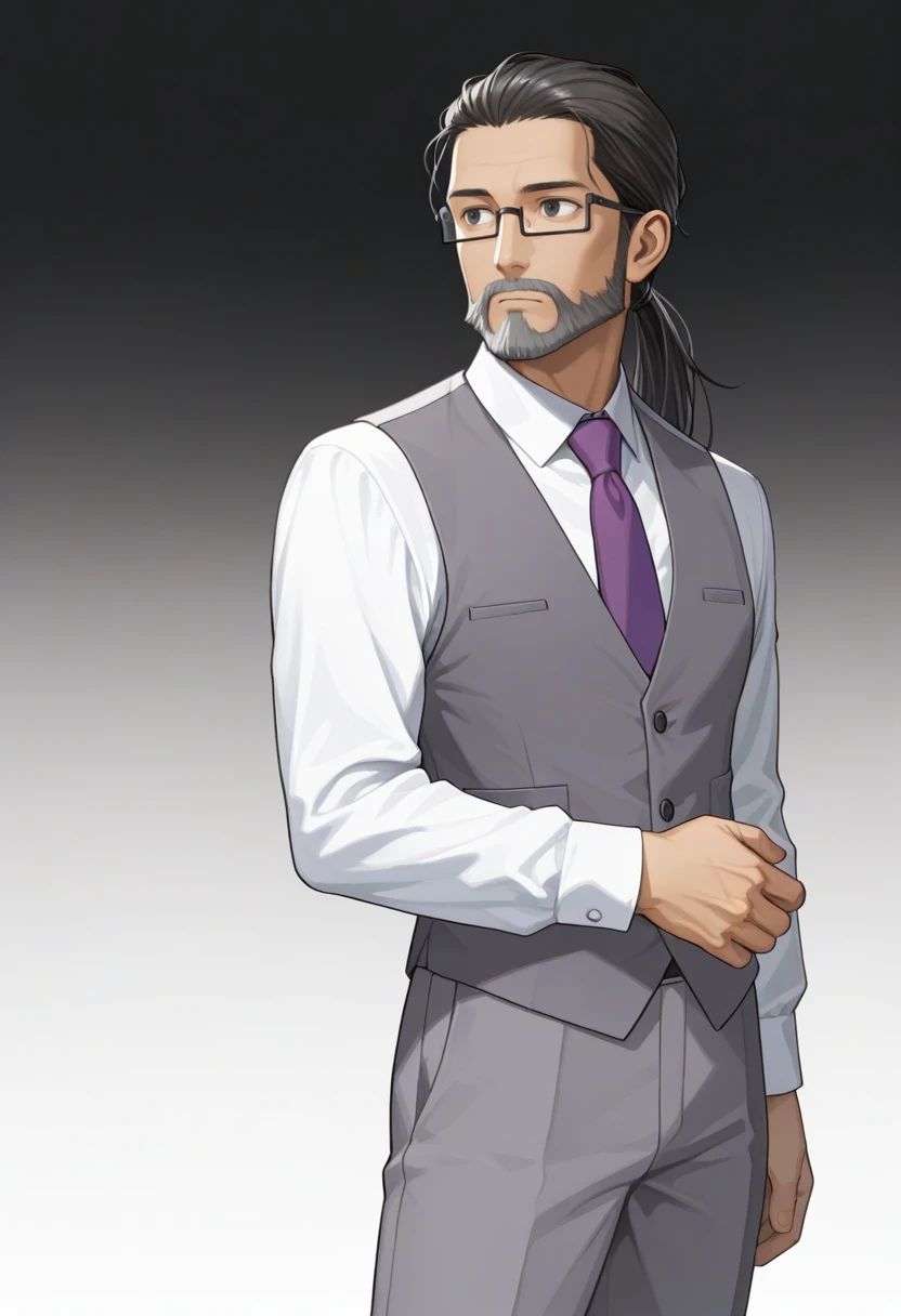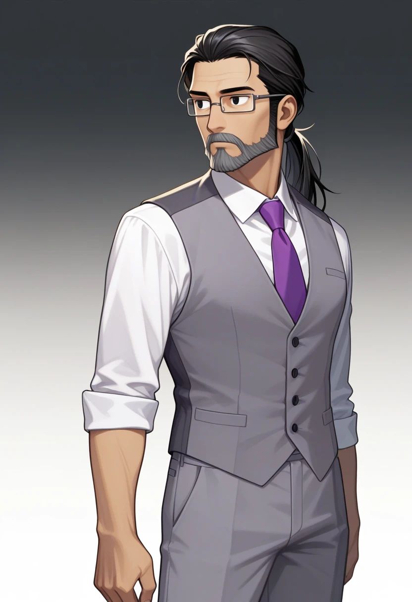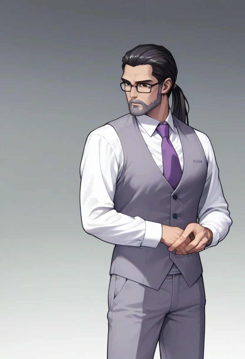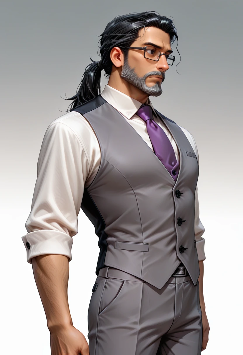 long hair, ponytail, black hair, grey beard, facial hair, rectangular glasses, black hair, black eyes, 30 years old, white shirt, grey waistcoat, purple tie, grey pantsDescription