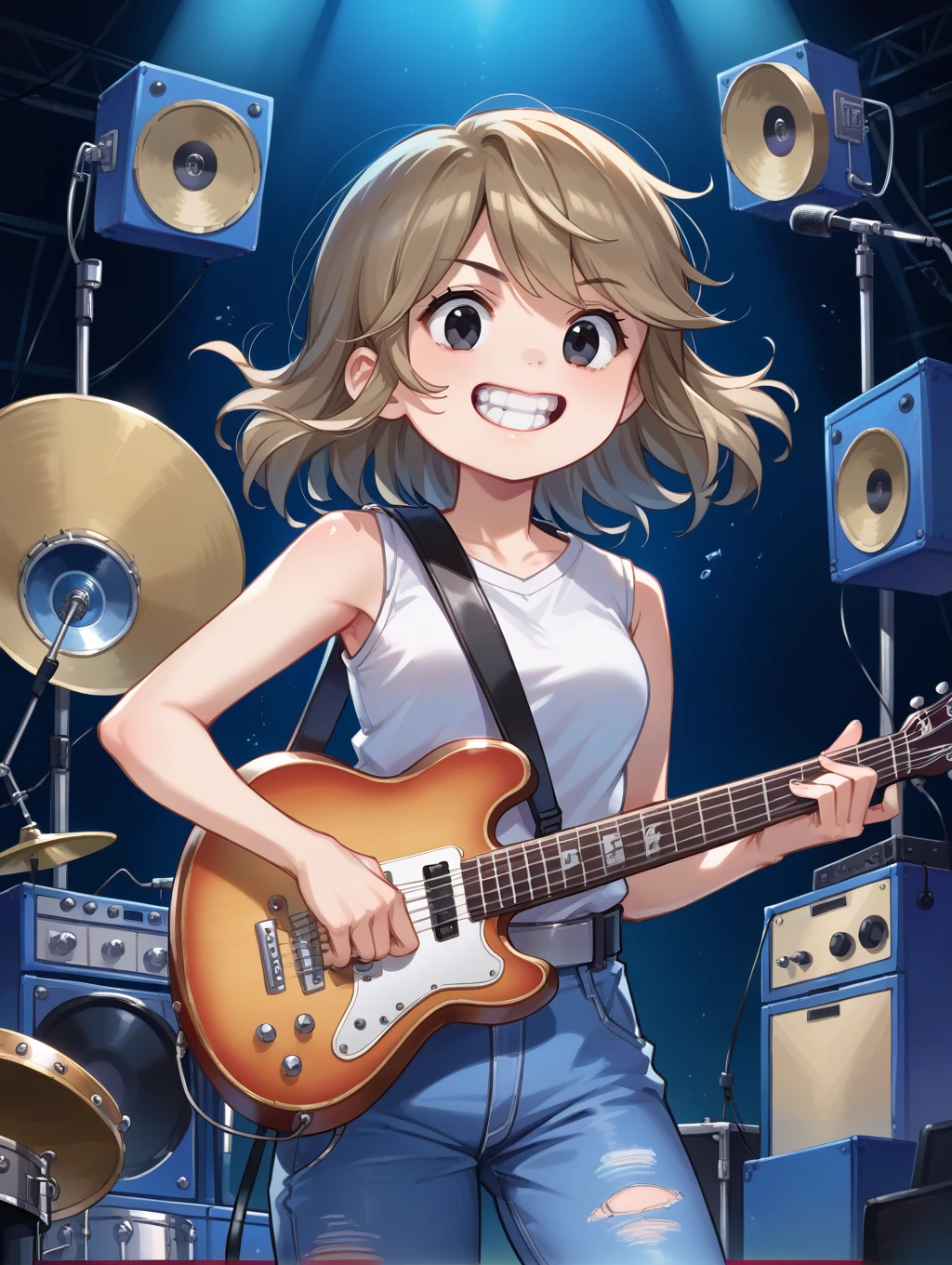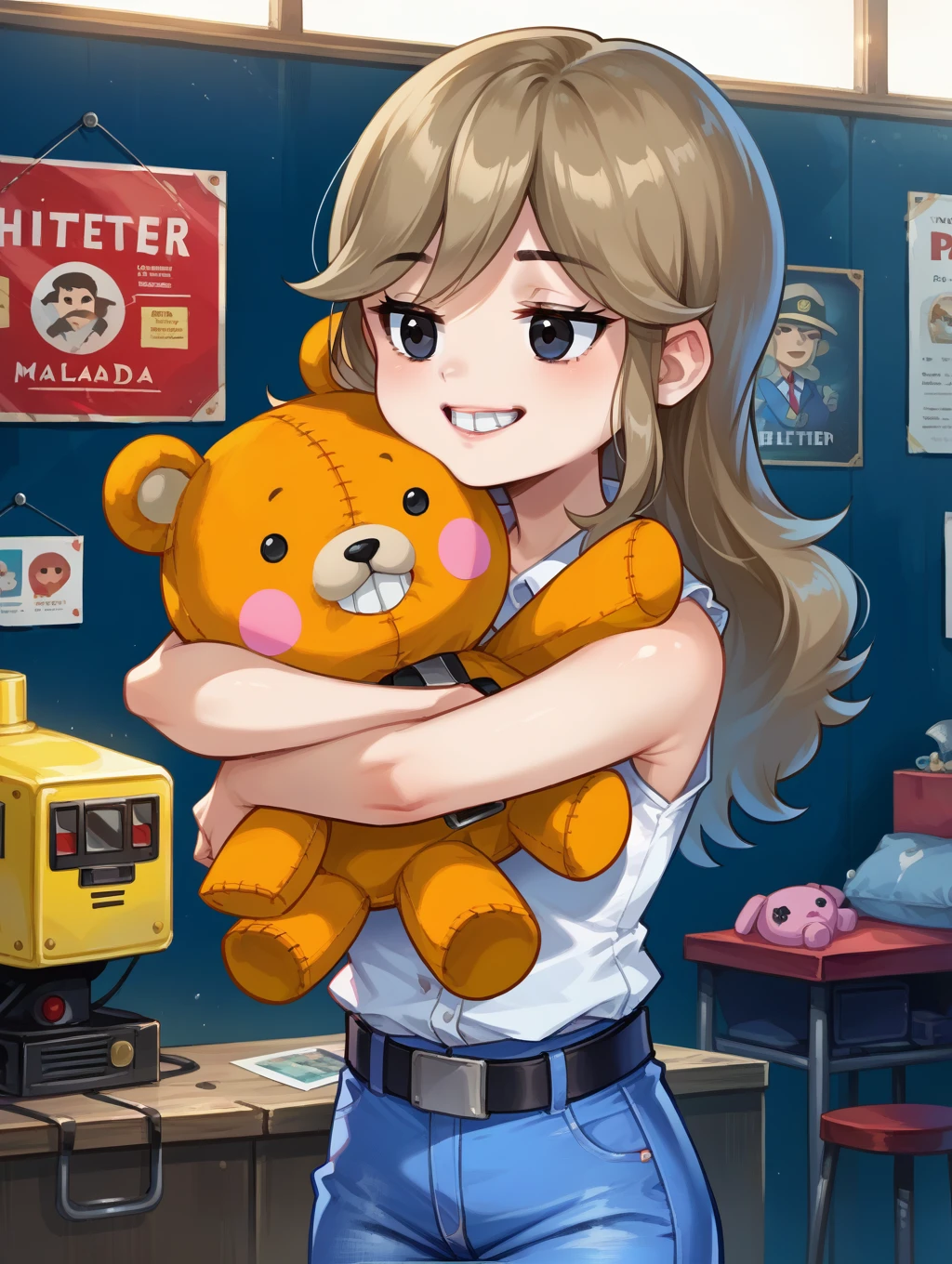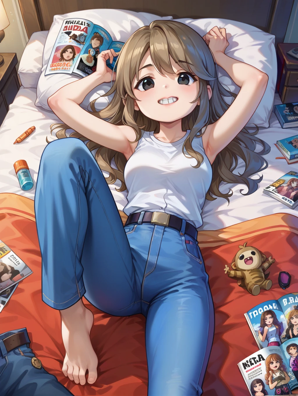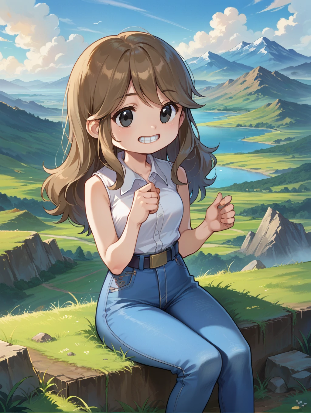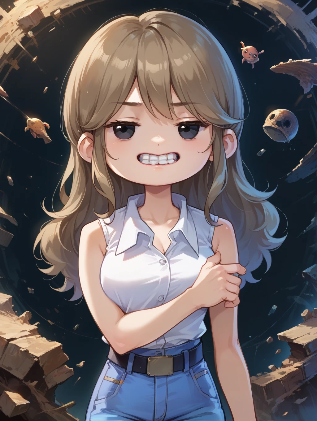 Alienada,1girl,long brown hair with bangs,white sleeveless shirt,black eyes, blue jeans,belt, teeth, shirt tucked in