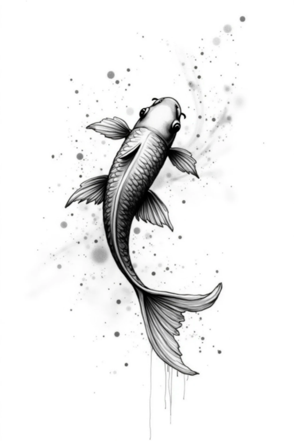 Black and white ink splash style, draw a swimming koi, fluid lines, ink drips, lucky fish, tranquil vibe, plain white base.