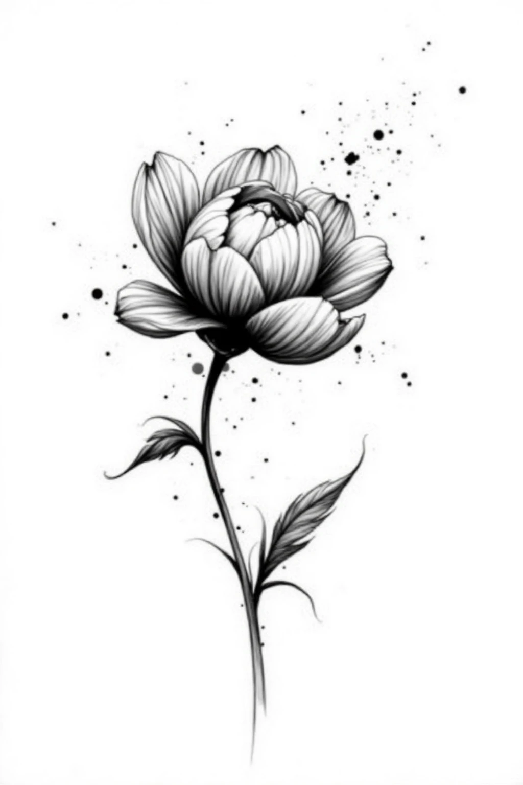 Black and white ink splash style, illustrate a blooming peony, delicate petals, ink splatters, traditional flower, graceful look, white space.