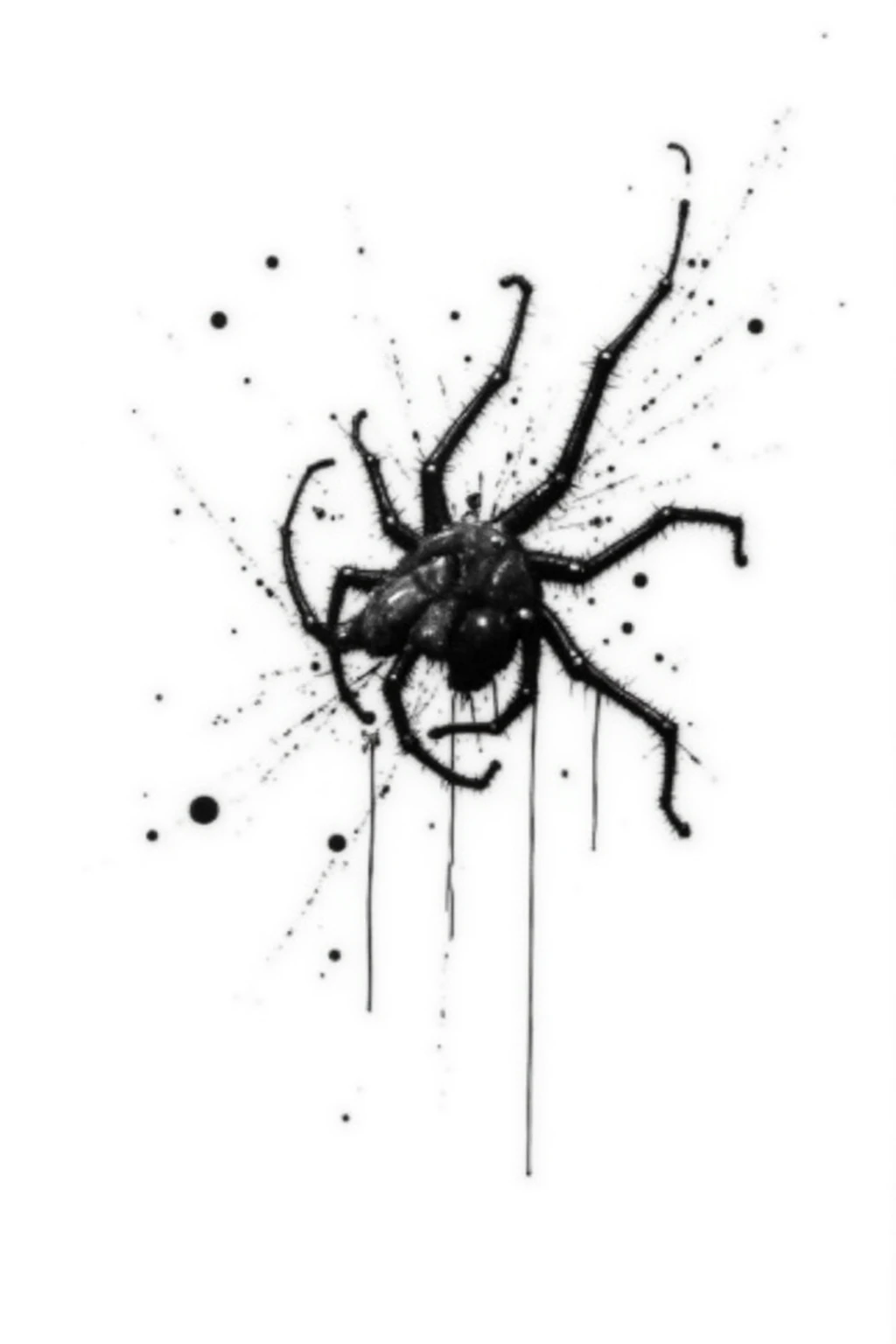 Black and white ink splash style, create a climbing spider, intricate form, ink drips, tiny creature, unique posture, white background.