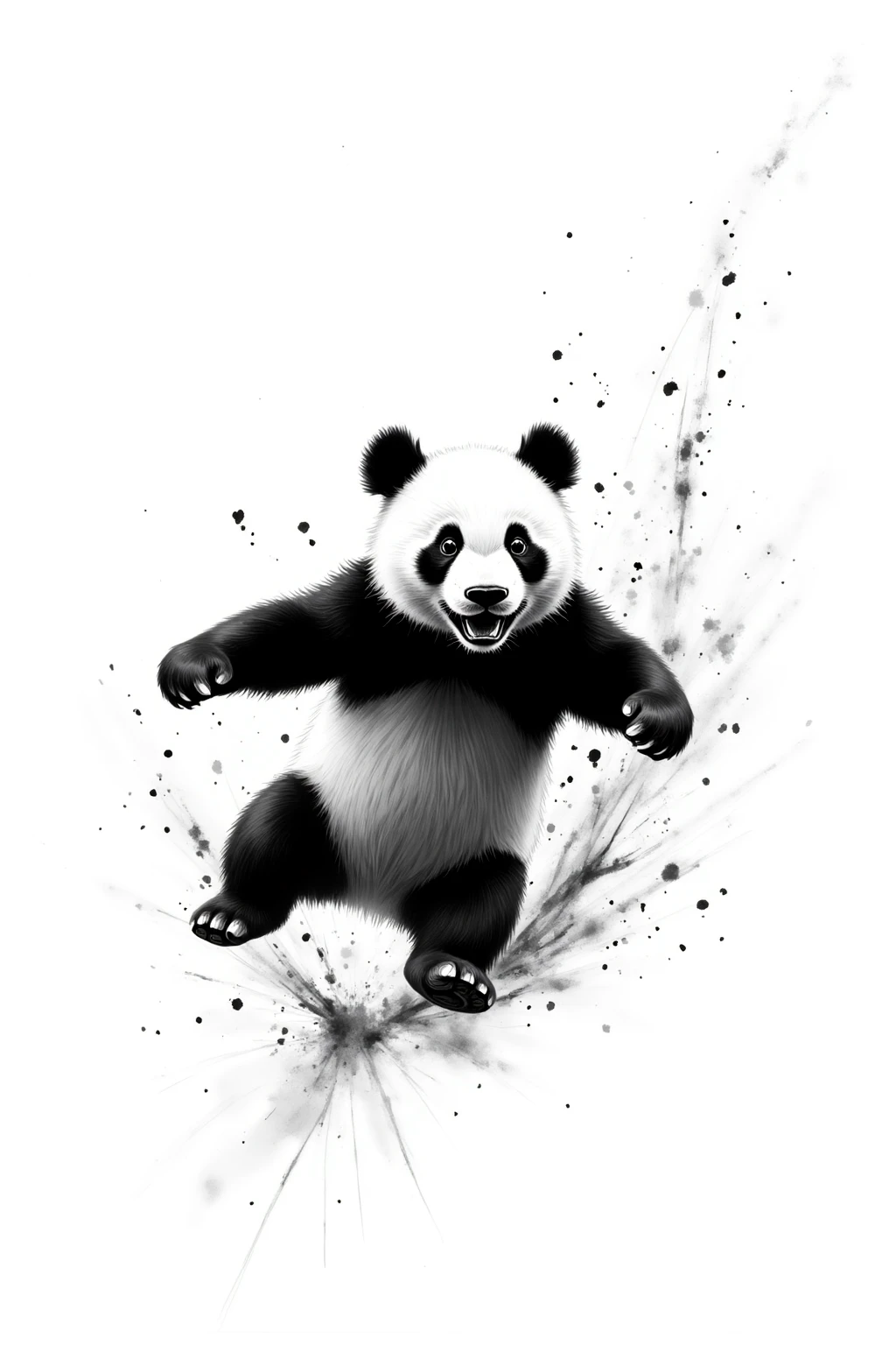 Black and white ink splash style, show a leaping panda, cute form, ink blots, national treasure, lively movement, simple white space.