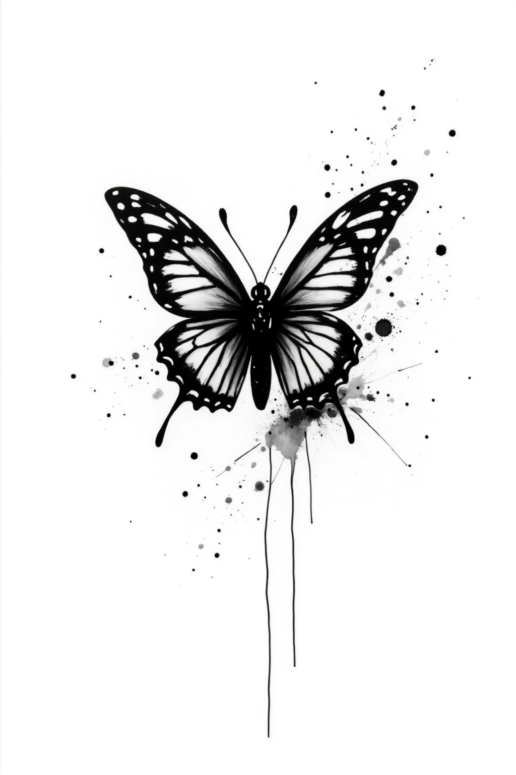 Black and white ink splash style, draw a dancing butterfly, beautiful wings, ink splatters, colorful insect, light movement, white space.