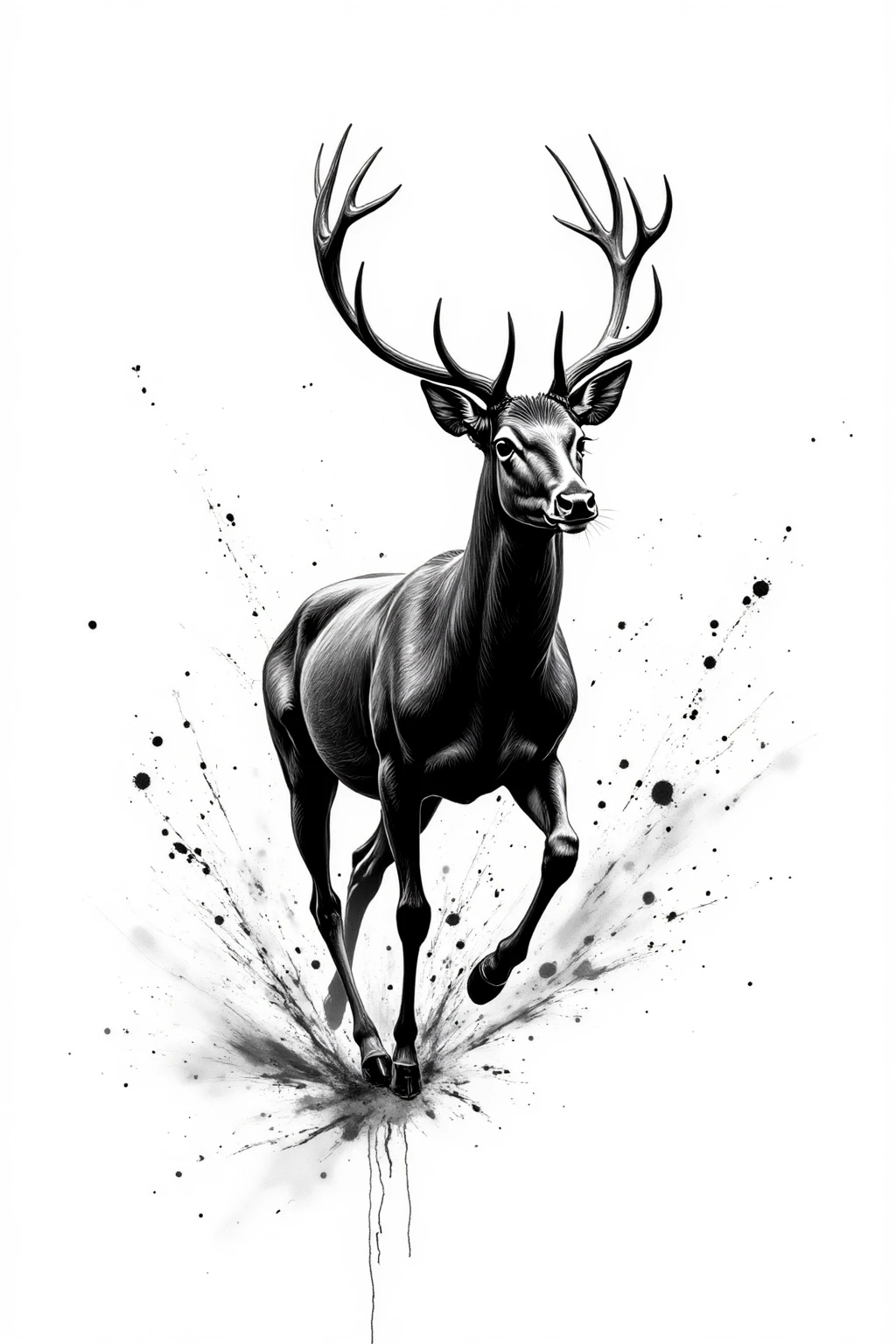 Black and white ink splash style, portray a running deer, agile figure, ink blots, forest animal, free posture, white backdrop.