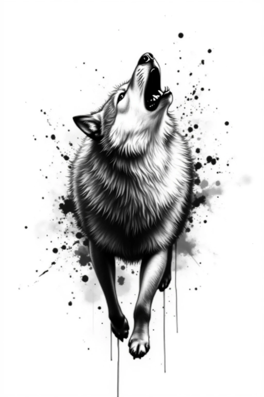Black and white ink splash style, design a howling wolf, fierce expression, ink splashes, wild animal, strong presence, white background.