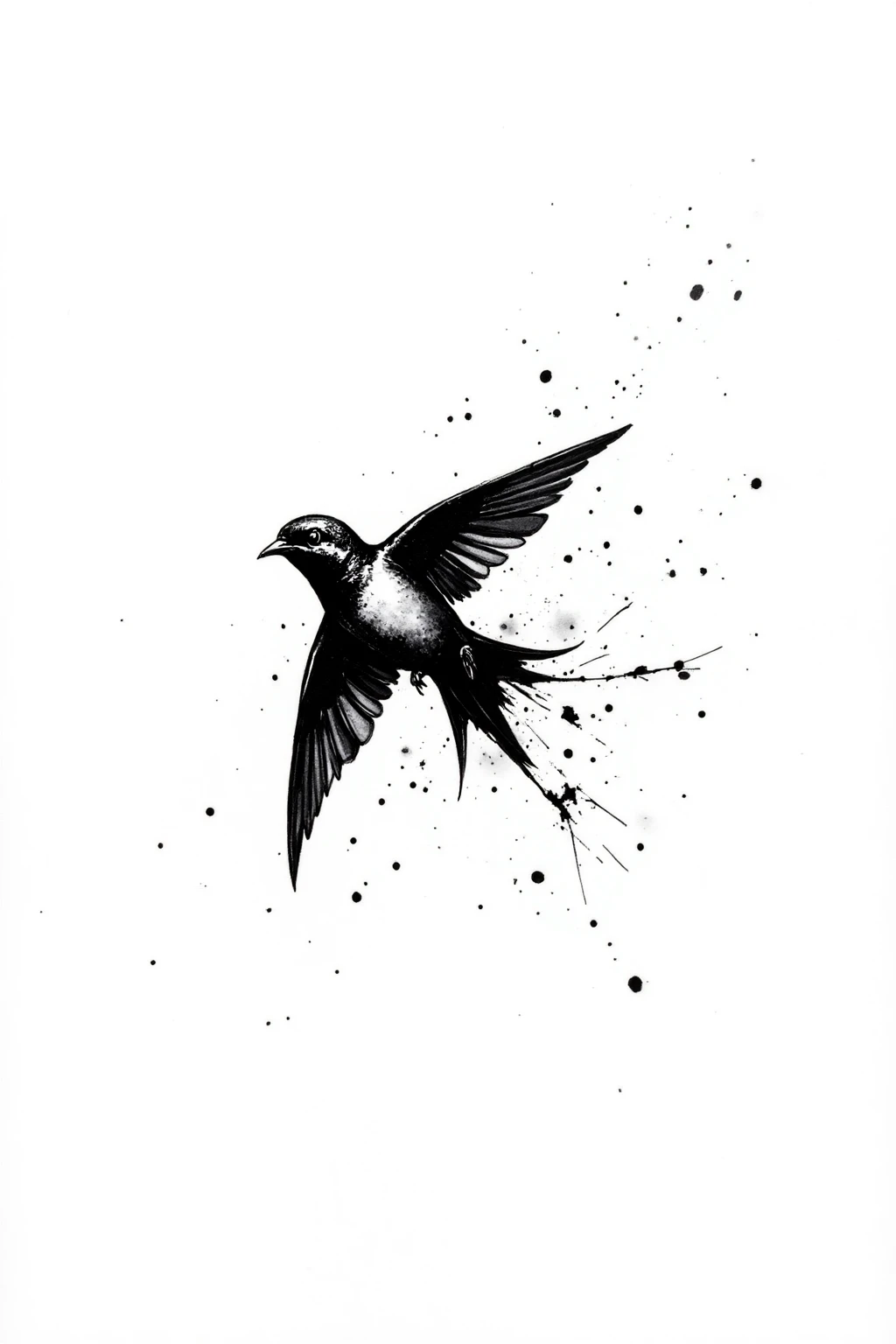 Black and white ink splash style, make a flying swallow, swift lines, ink splashes, small bird, lively feel, plain white base.