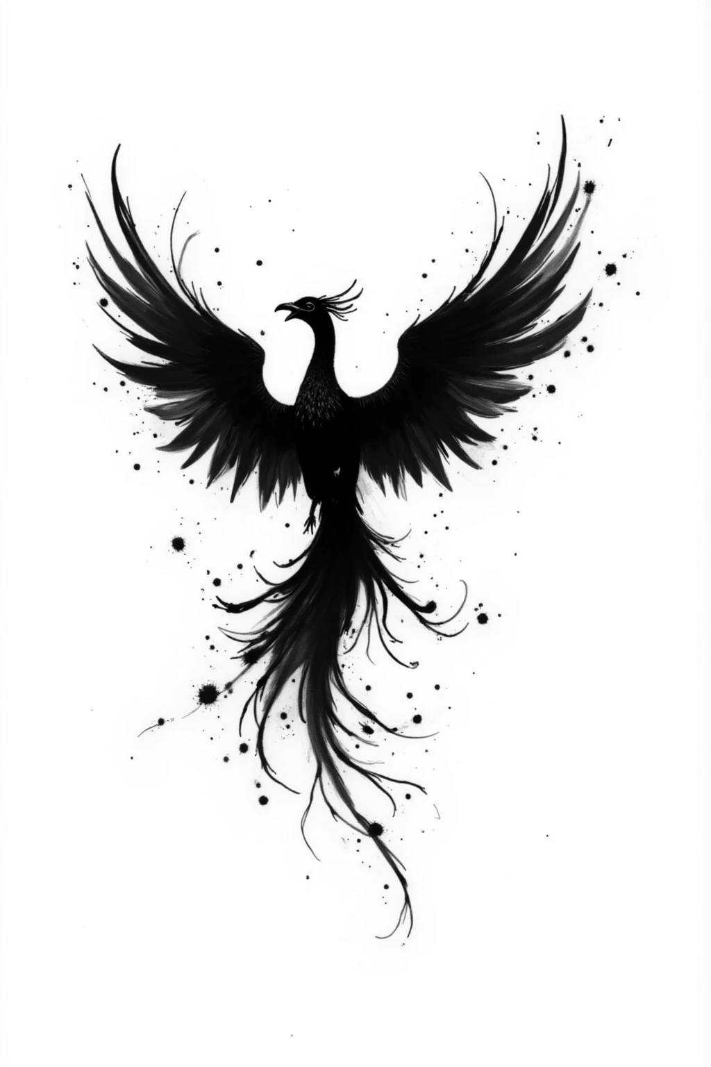 Black and white ink splash style, create a soaring phoenix, flowing ink, elegant wings, symbolic bird, artistic splashes, pure white backdrop.