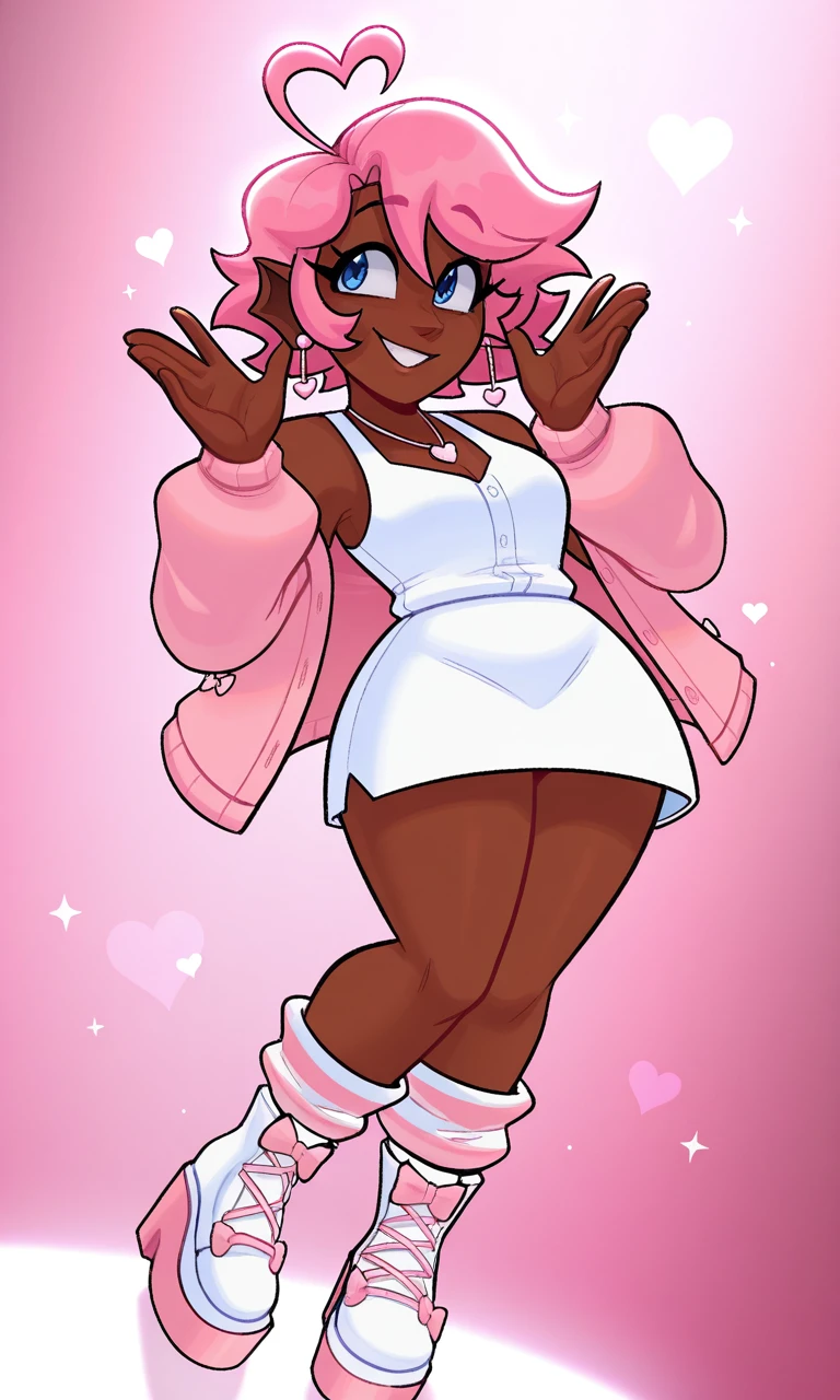 Jaden_Sinclair, pink_hair, heart_ahoge, blue_eyes, dark_skin, 1girl, female, webbed_ears, plus_sized, white_heart_earrings