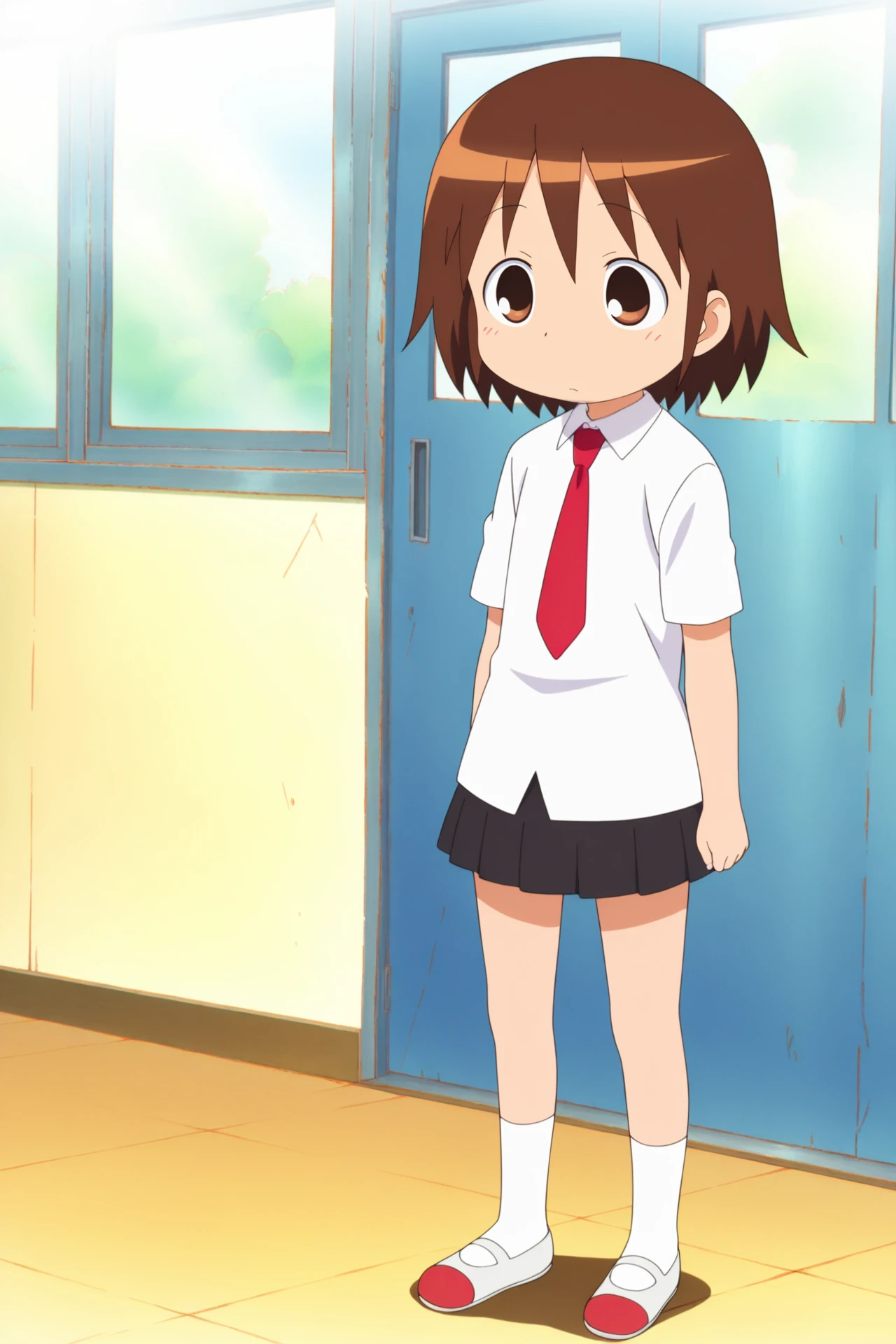 necktie,red necktie,school uniform,shirt,white shirt,short sleeves,skirt,socks,white socks,uwabakiDescription