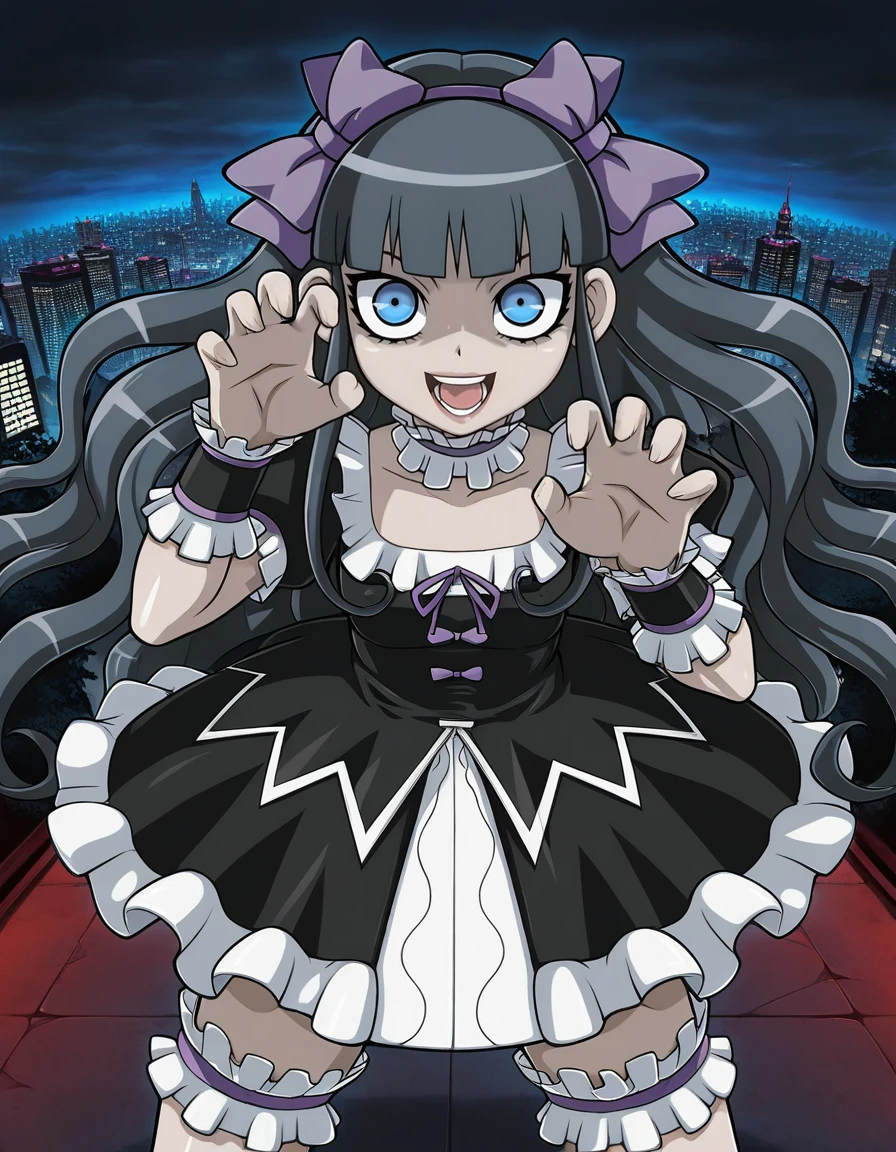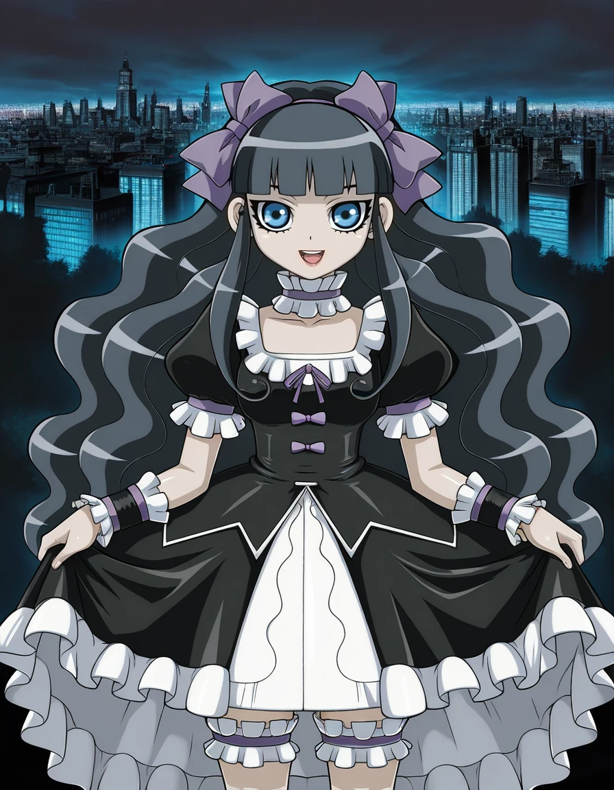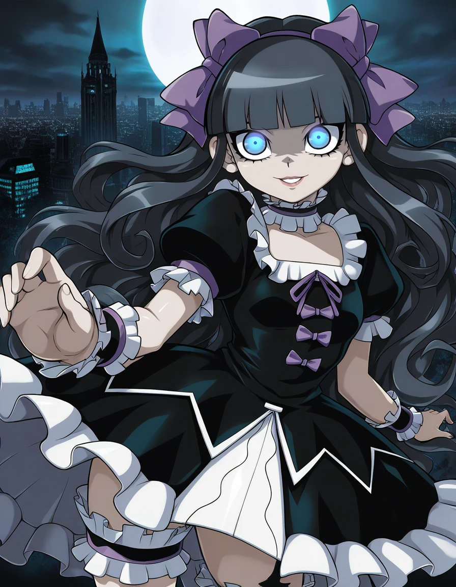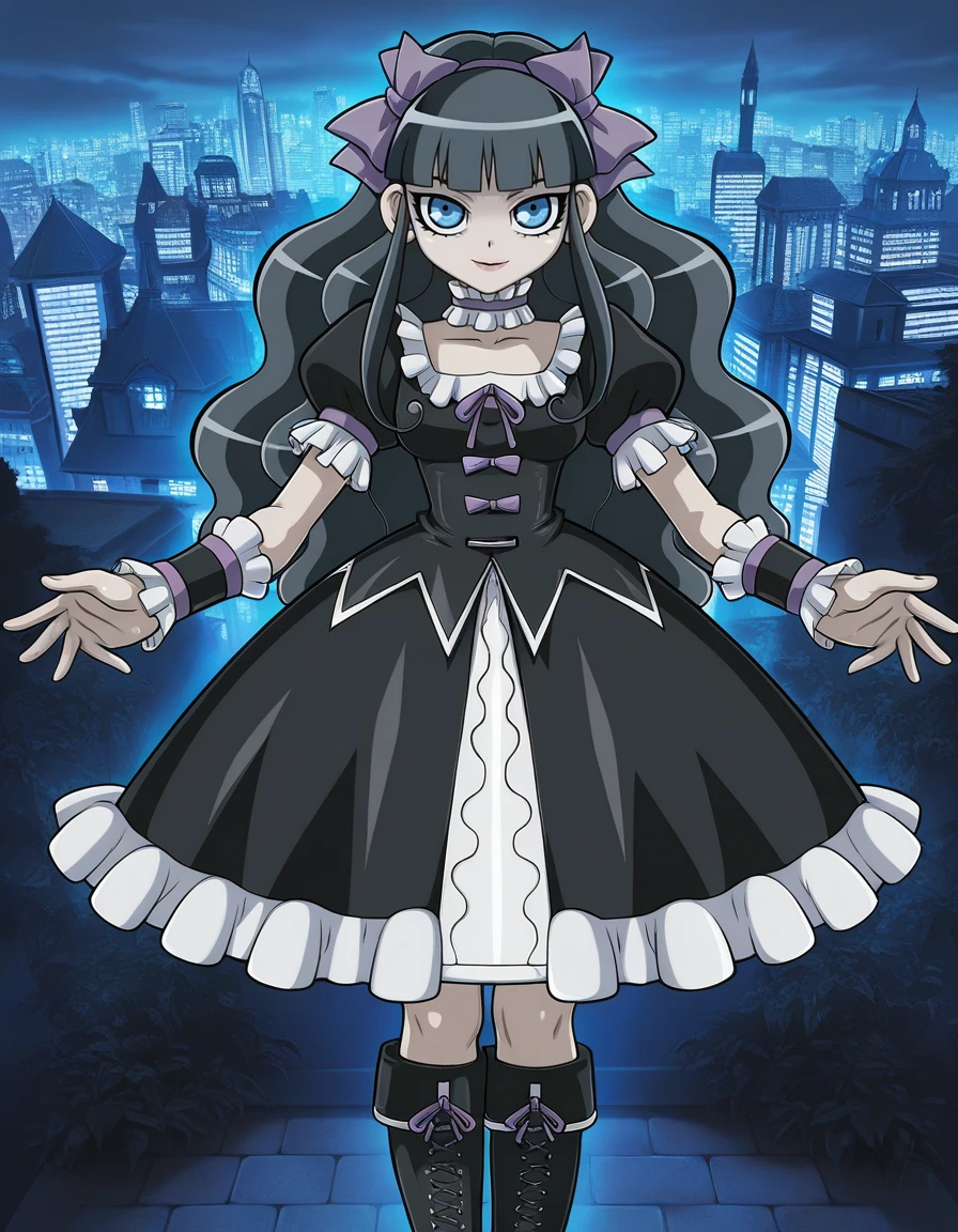 Alice,1girl,solo,blue eyes,long hair,gothic lolita,black hair,dress,choker,frills,wrist cuffs,hair bow,purple bow,knee boots, black footwear,