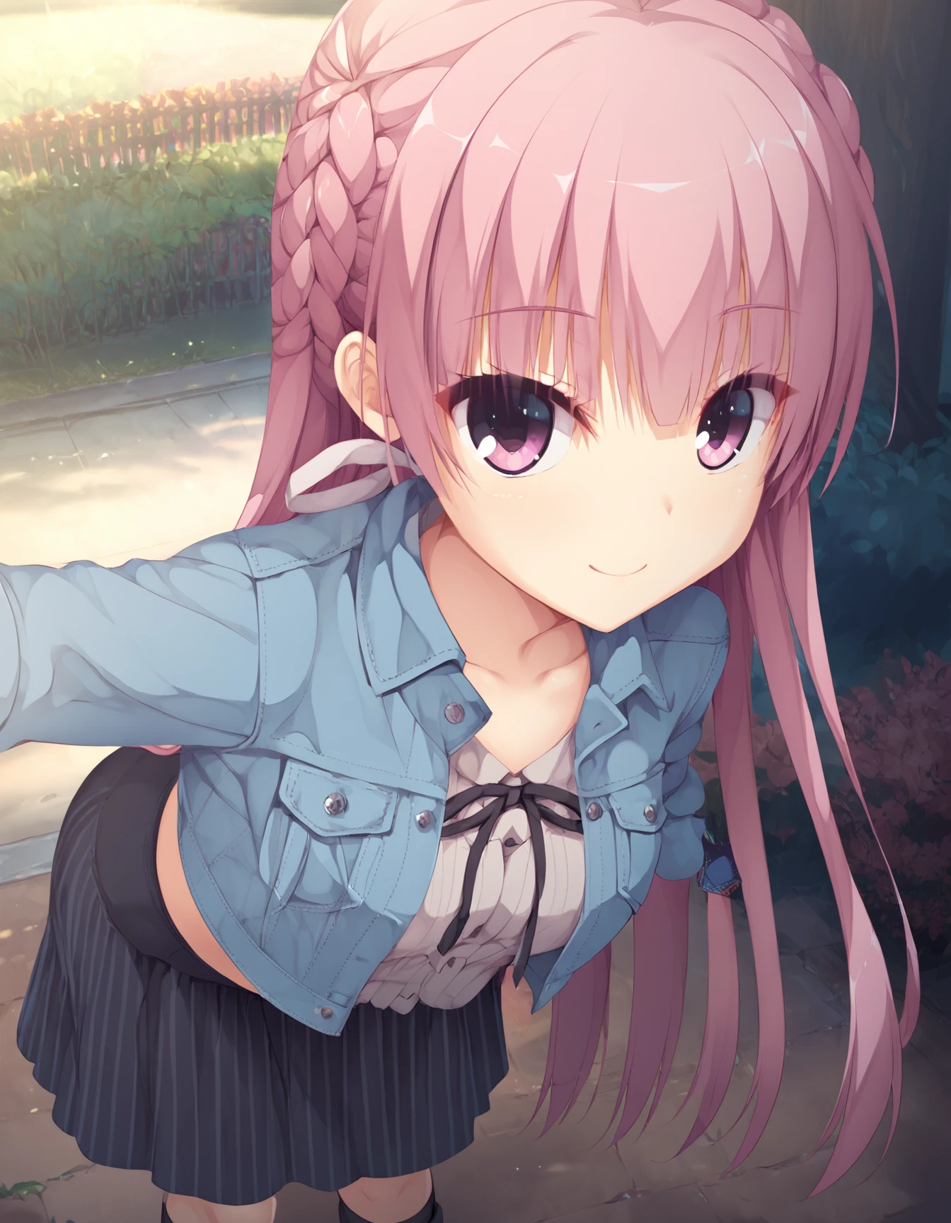 casual,mitsukasa_ayase_casual,braid,hair_ribbon,white_ribbon,jacket,blue_jacket,denim_jacket,open_jacket,cropped jacket,black_ribbon,white_shirt,skirt,black_skirt,striped_skirt,socks,black_socks,ankle_socks,boots,
