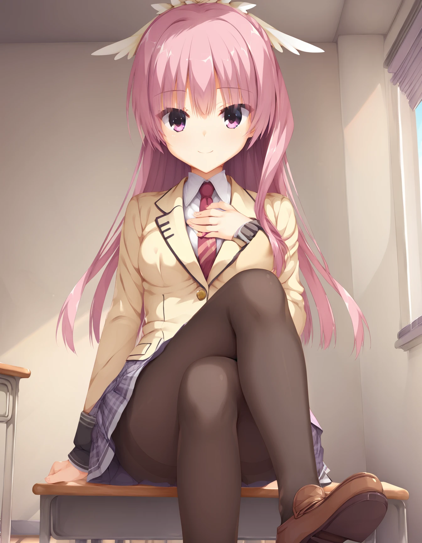mitsukasa_ayase_school_uniform,school_uniform,hair_ornament,wing_hair_ornament,necktie,red_necktie,jacket,yellow_jacket,blazer,long_sleeves,shirt,white_shirt,collared_shirt,skirt,grey_skirt,pleated_skirt,plaid_skirt,miniskirt,pantyhose,black_pantyhose,shoes,loafers,brown_footwear,