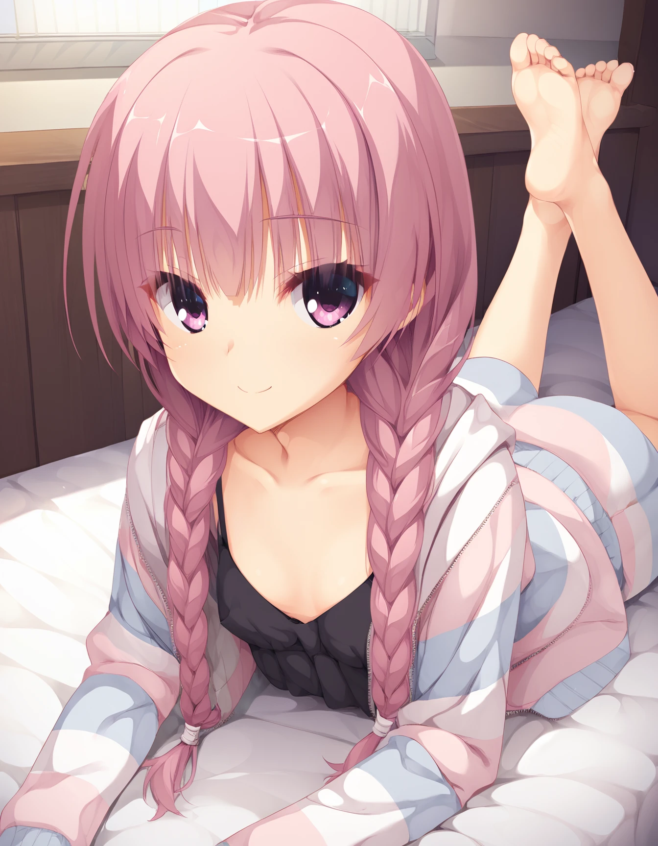mitsukasa_ayase_roomwear,roomwear,braid,twin_braids,loungewear,jacket,striped_jacket,open_jacket,long_sleeves,sleeves_past_wrists,hood,hood_down,camisole,black_camisole,shorts,striped_shorts,slippers,white_footwear,