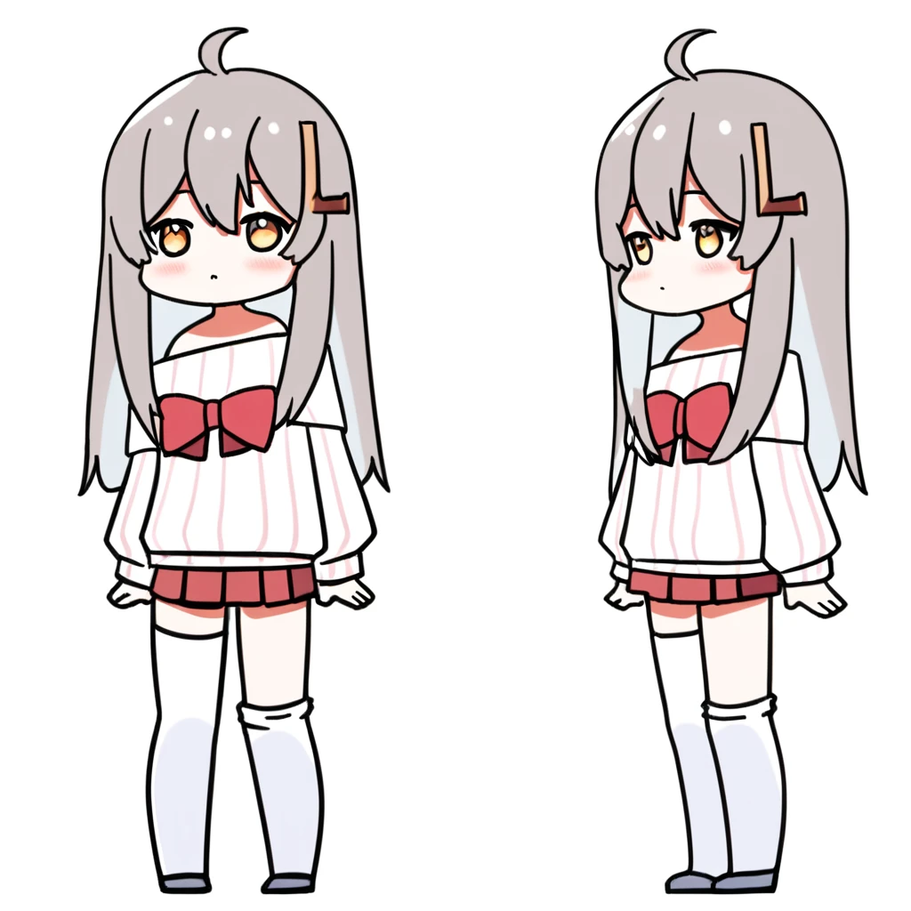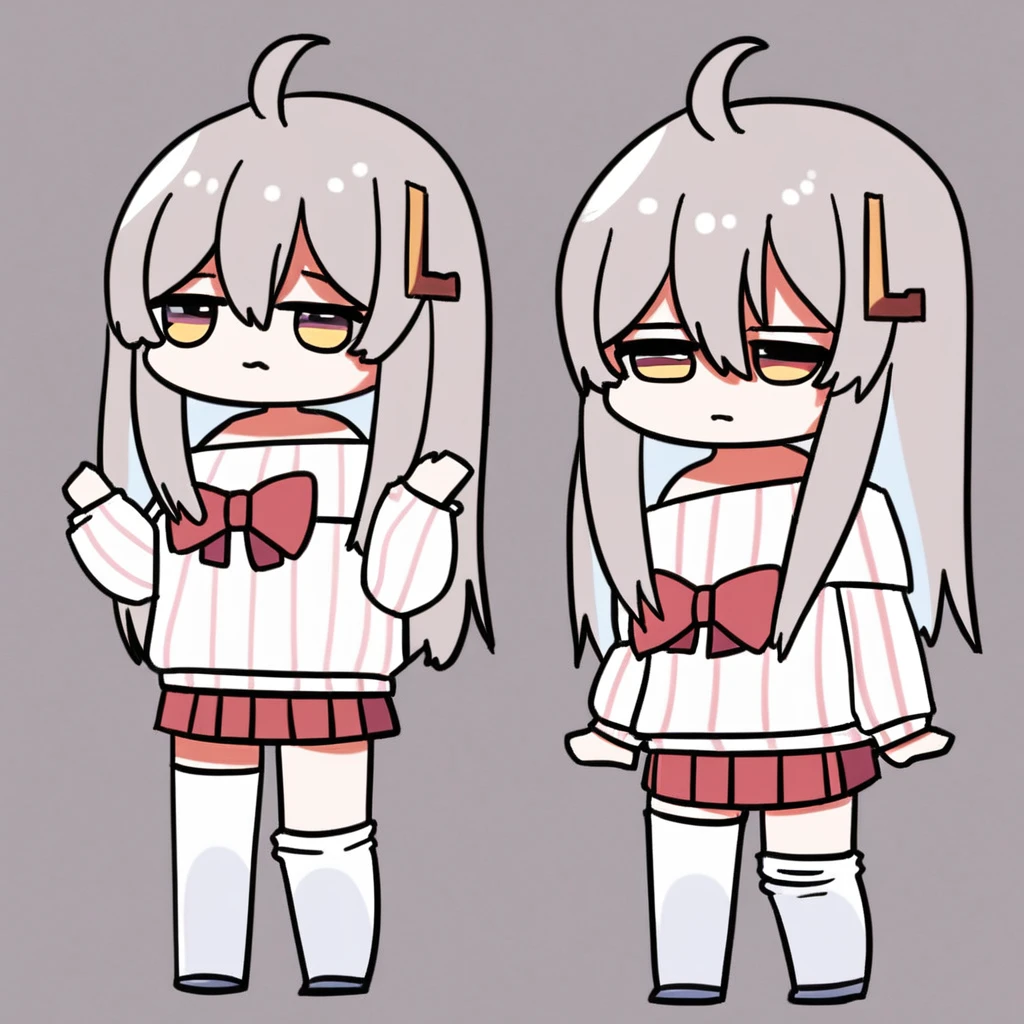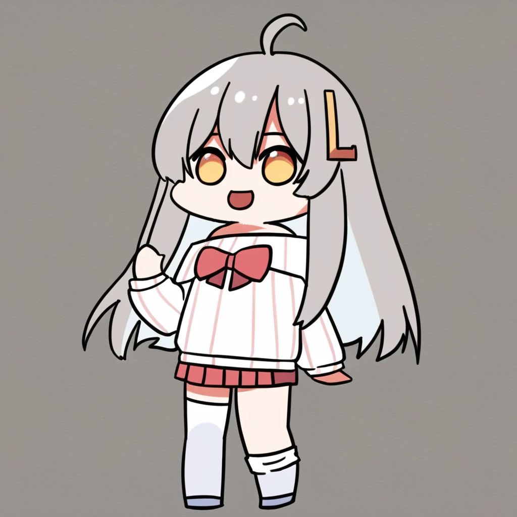 vpet, 1girl, solo, grey hair, chibi, bangs, hair ornament, L-shaped barrette, one barrette, ahoge, long hair, skirt, long sleeves, full body, red skirt, pleated skirt, shirt, bow, red bow, standing, white shirt, striped shirt, off shoulder, sweater, vertical stripes shirt, hair between eyes, sleeves past wrists, white sweater, puffy long sleeves, bare shoulders, virtual youtuber, miniskirt, off-shoulder shirt, striped shirt, asymmetrical legwear, hairclip, facing viewer, eye contact,off-shoulder sweater, looking at viewer, puffy sleeves,