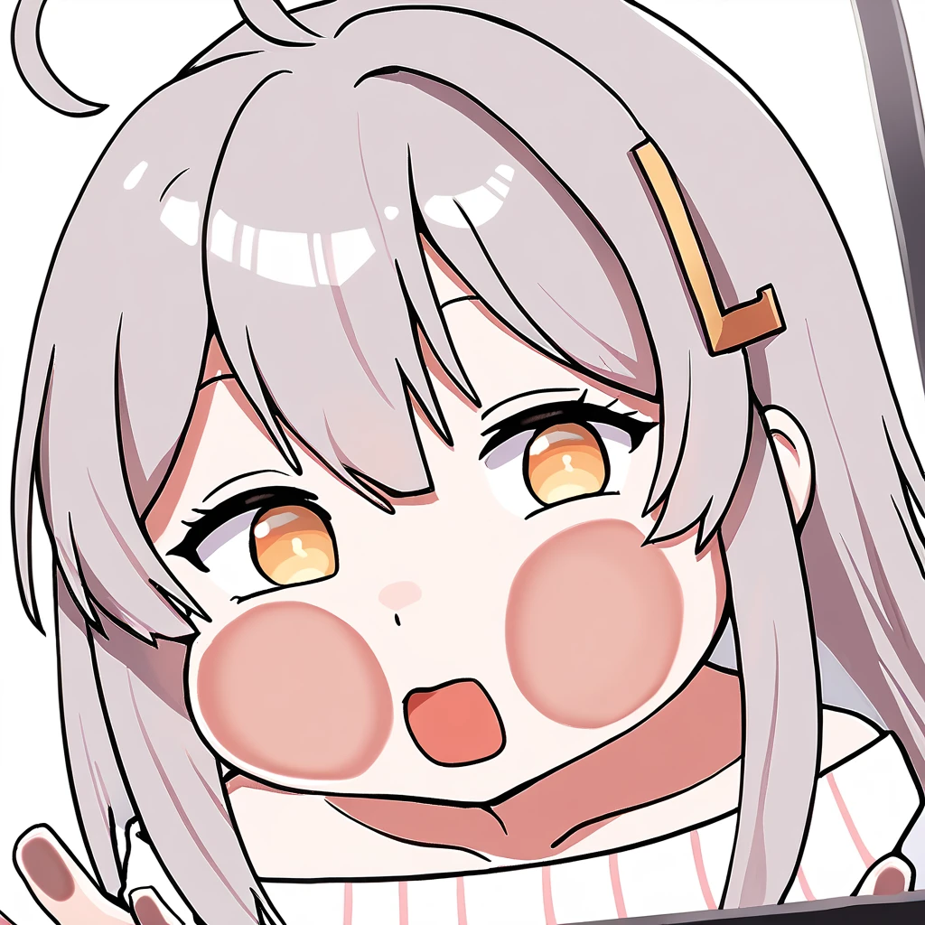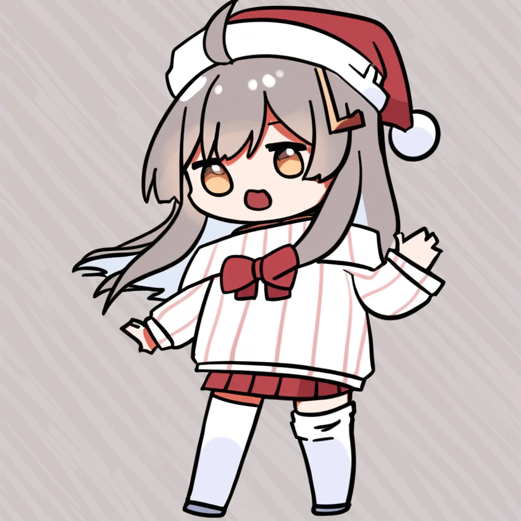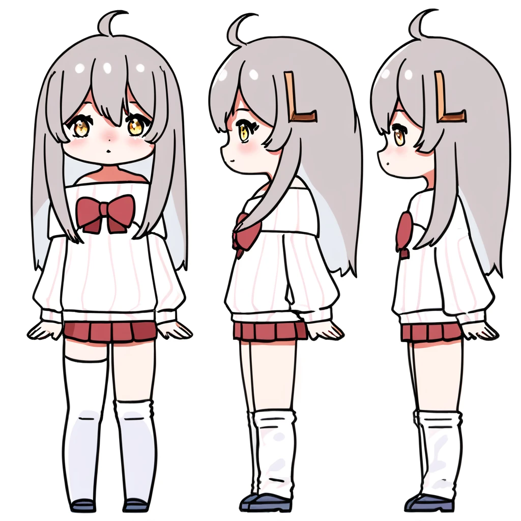 vpet, 1girl, solo, grey hair, chibi, bangs, hair ornament, L-shaped barrette, one barrette, ahoge, long hair, skirt, long sleeves, full body, red skirt, pleated skirt, shirt, bow, red bow, standing, white shirt, striped shirt, off shoulder, sweater, vertical stripes shirt, hair between eyes, sleeves past wrists, white sweater, puffy long sleeves, bare shoulders, virtual youtuber, miniskirt, off-shoulder shirt, striped shirt, asymmetrical legwear, hairclip, facing viewer, eye contact,off-shoulder sweater, looking at viewer, puffy sleeves,