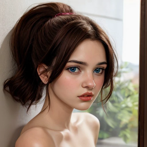 "cartoon of ktprd, close-up, high_ponytail, dressed, pink_cardigan, necklace, shoulder straps, indoors, room with big window"