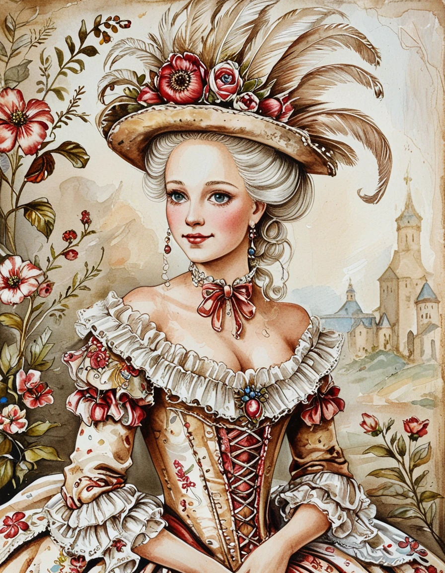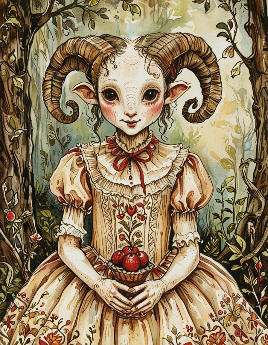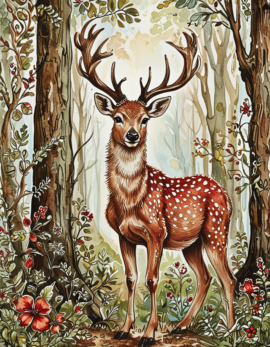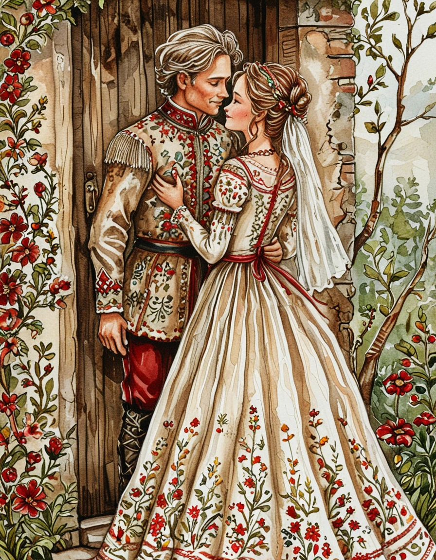 This watercolor style has inked outlines and an earthy red, brown, and green color palette. The watercolor texture is strong even if you don't ask for watercolor. It tends to put characters in 19th century fashion, and particularly likes floral dresses. Default settings tend to be in forests or the countryside.
