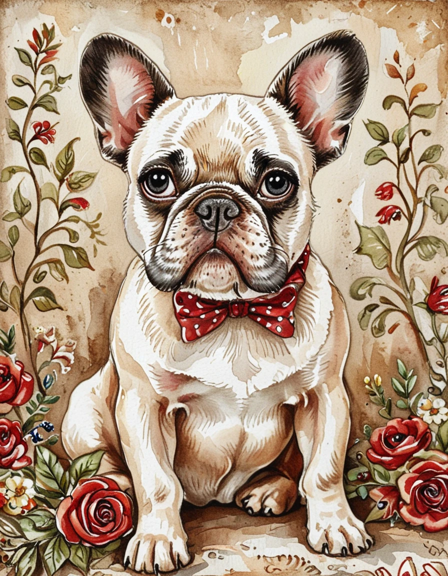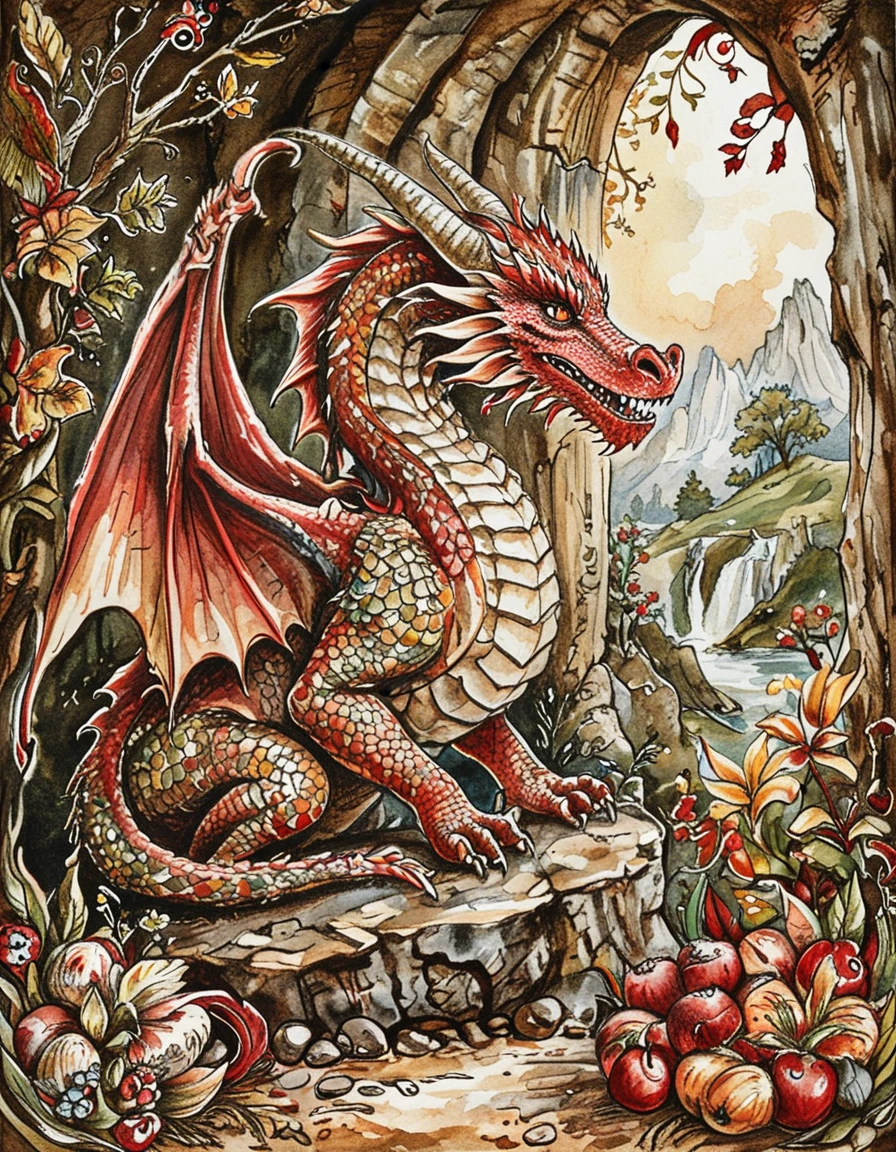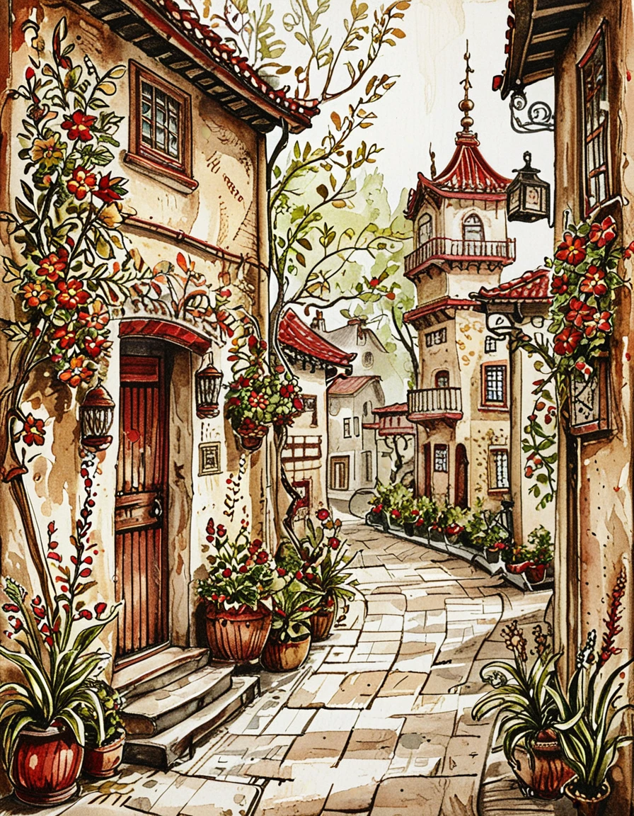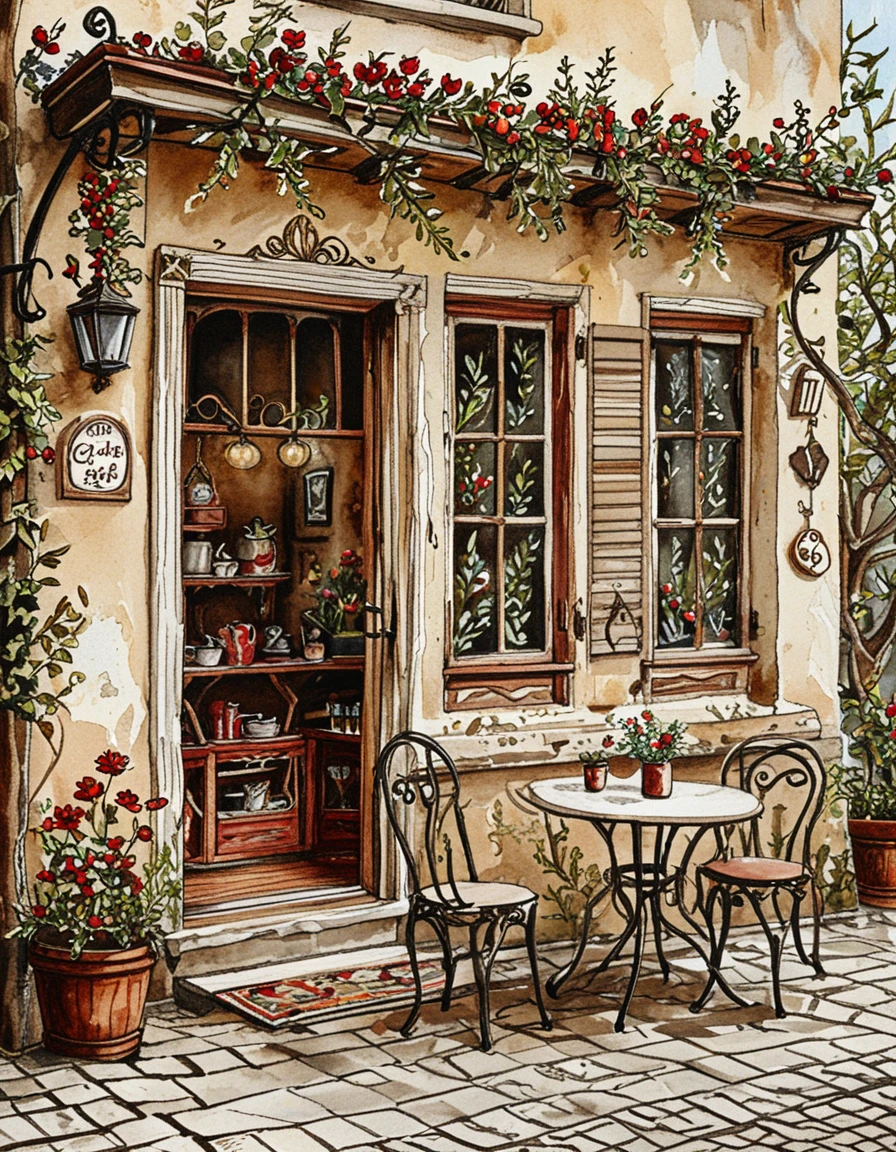 This watercolor style has inked outlines and an earthy red, brown, and green color palette. The watercolor texture is strong even if you don't ask for watercolor. It tends to put characters in 19th century fashion, and particularly likes floral dresses. Default settings tend to be in forests or the countryside.