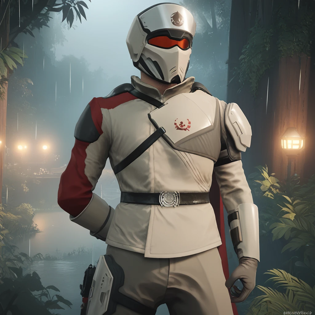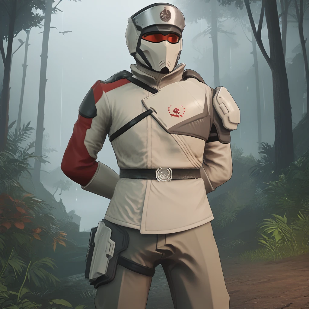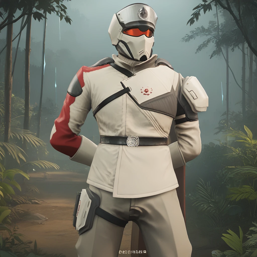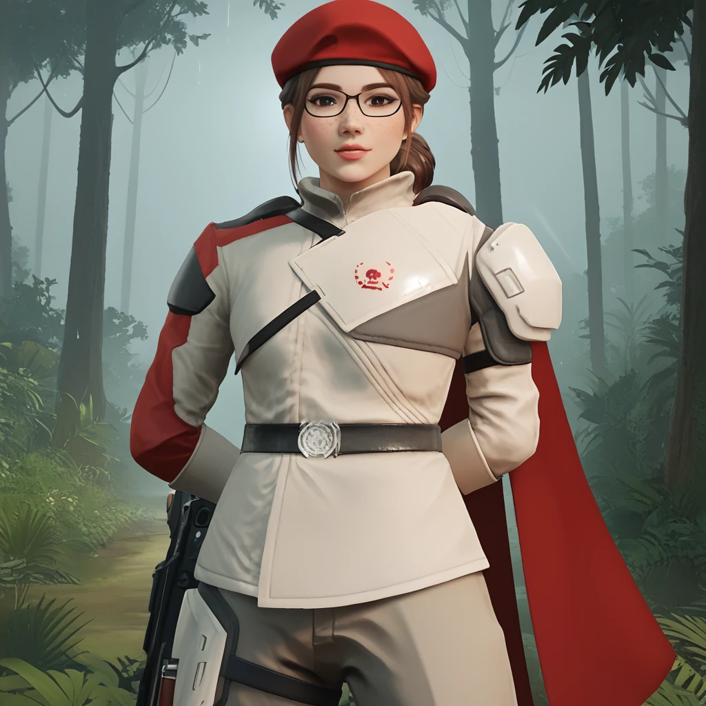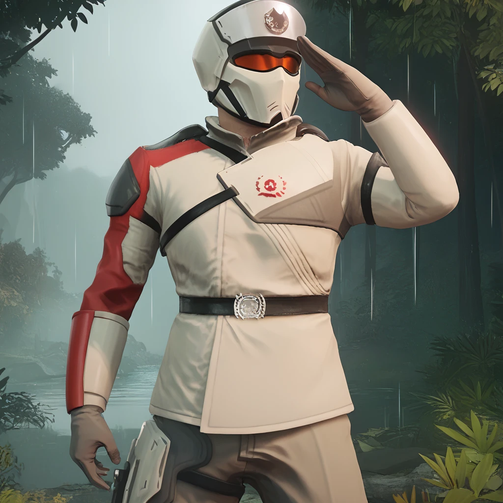 Inspector, helmet, Wearing a helmet, armor, uniform, boots, gloves, boots, wearing a red beret, white and red uniform, ((grey details)), grey chest pad, military, military uniform, belt, cape, science fiction,