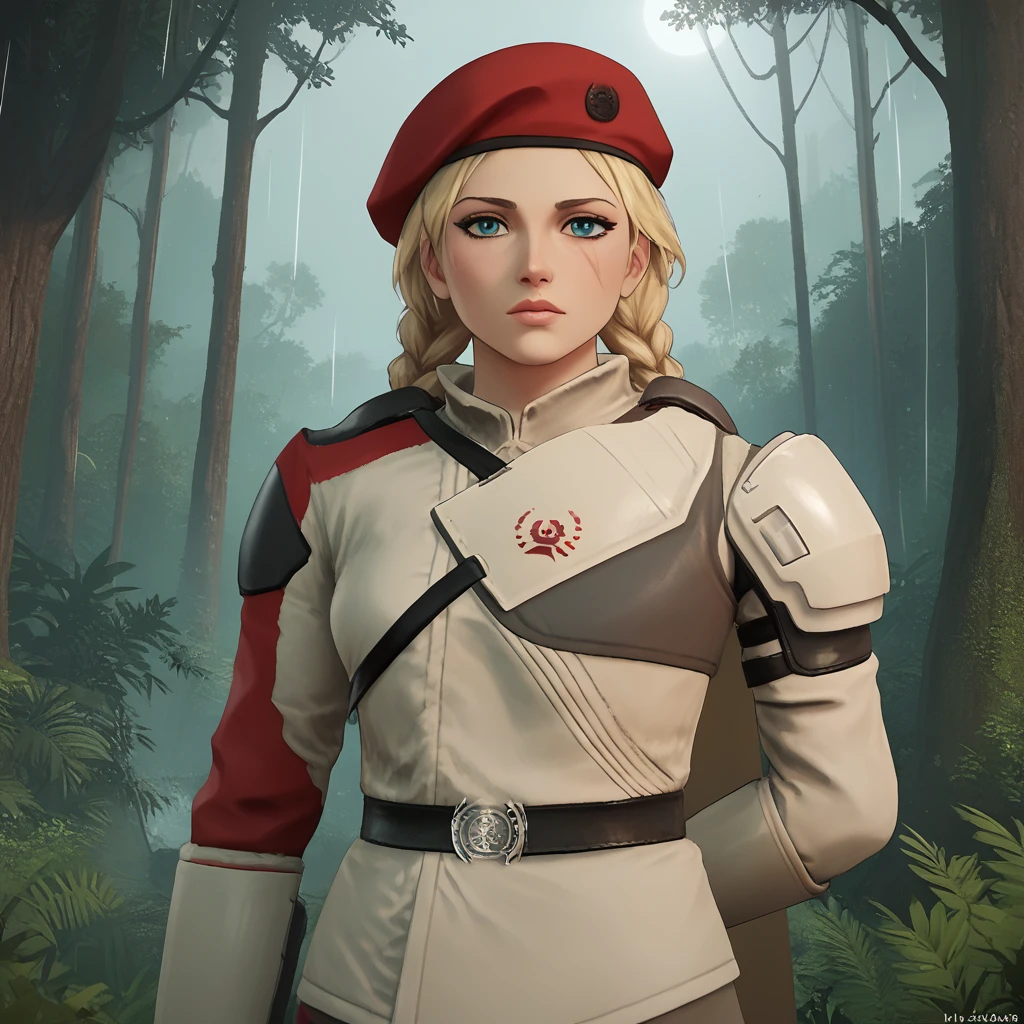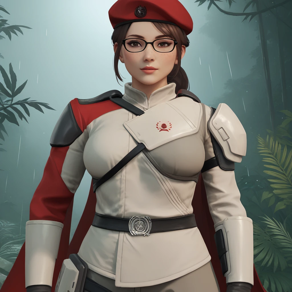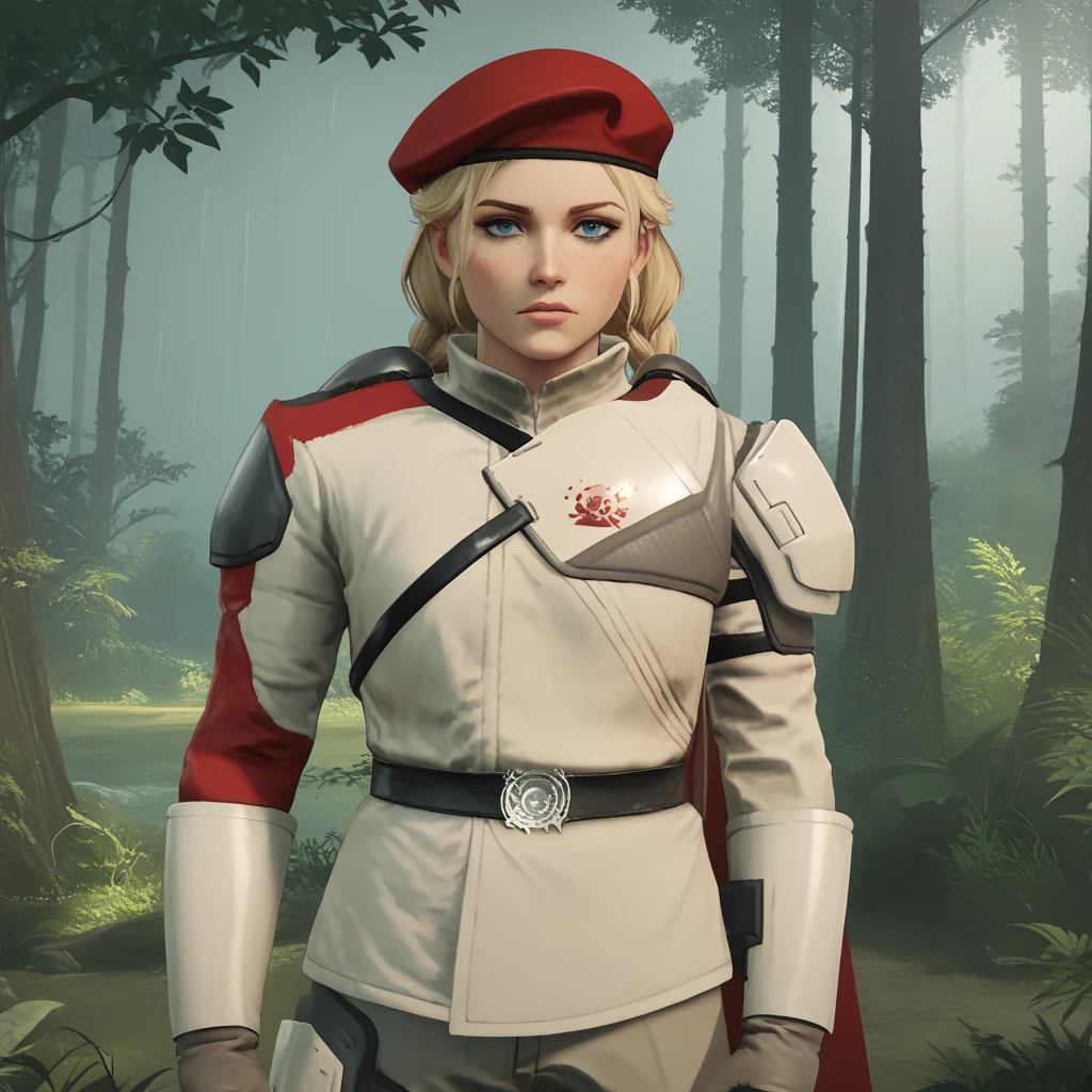 Inspector, helmet, Wearing a helmet, armor, uniform, boots, gloves, boots, wearing a red beret, white and red uniform, ((grey details)), grey chest pad, military, military uniform, belt, cape, science fiction, For better result