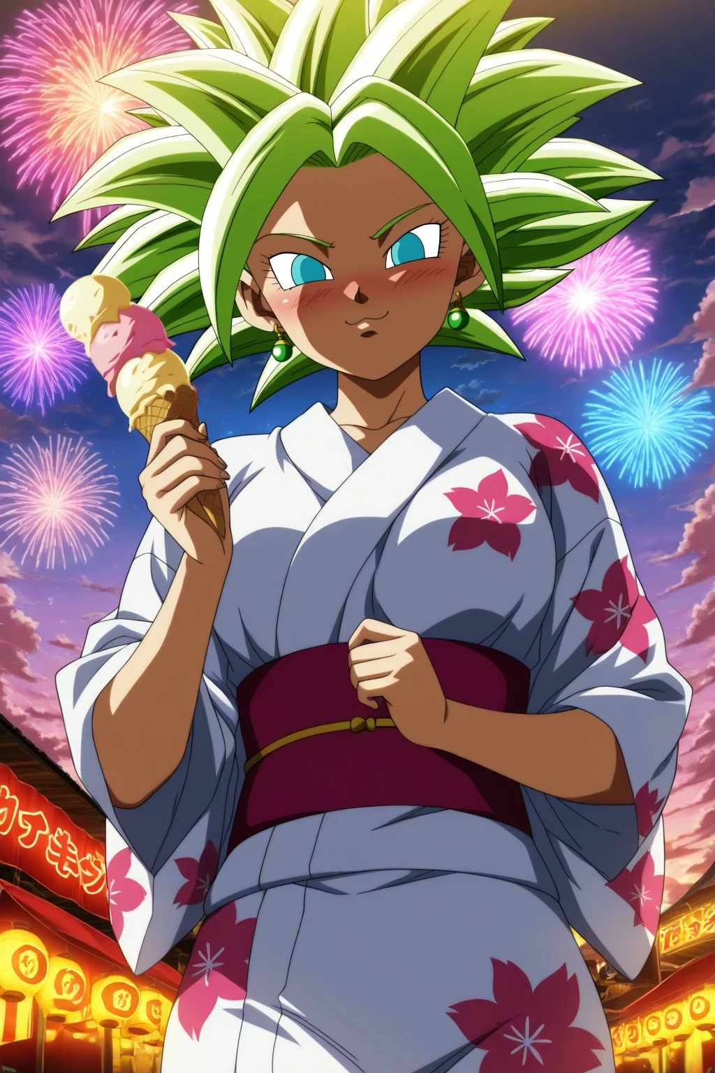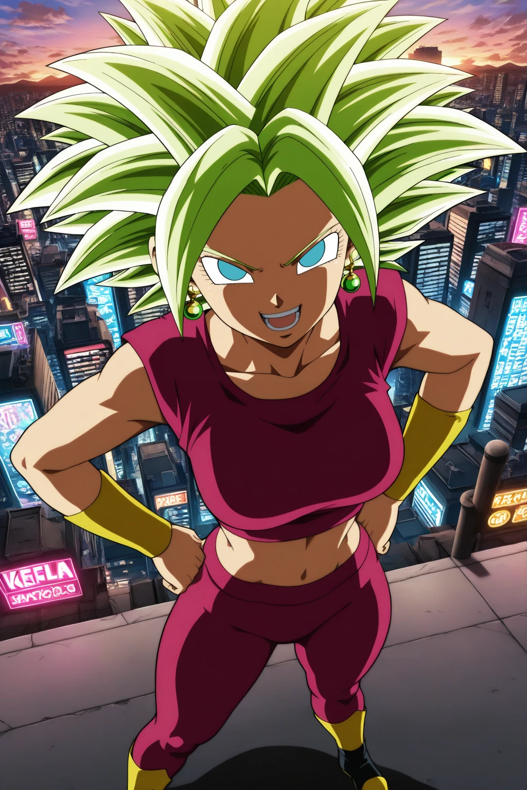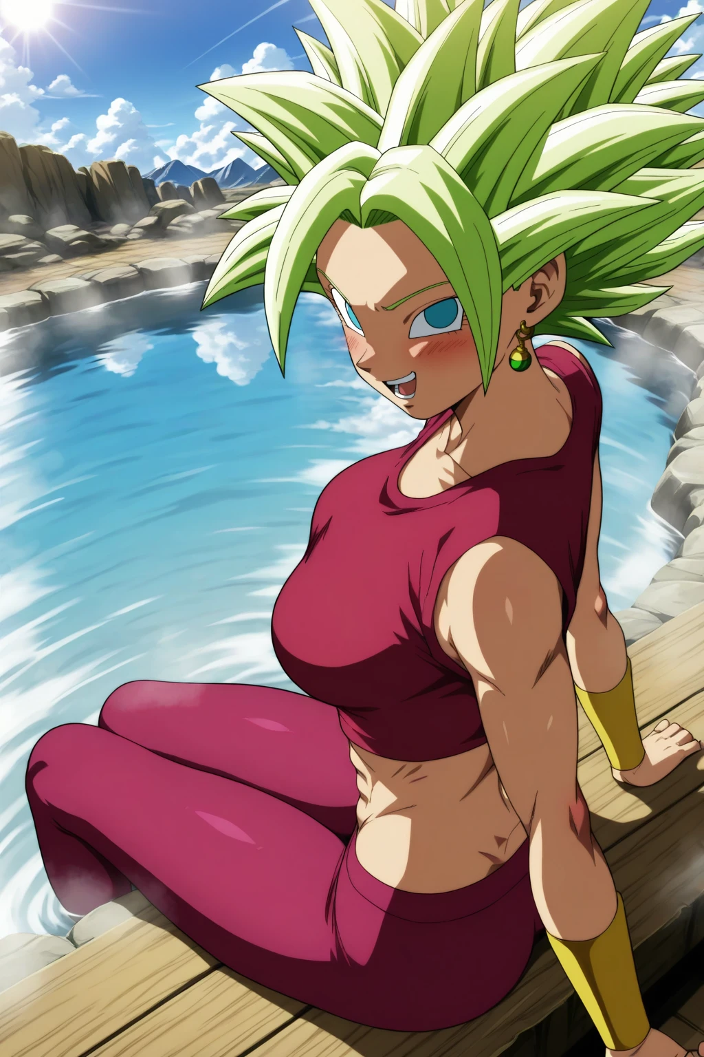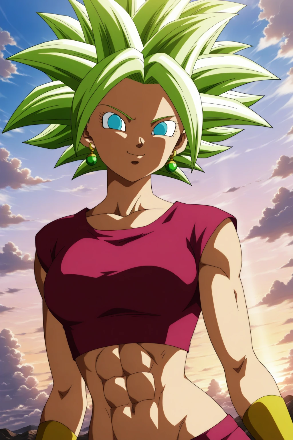 kefla, green hair, blue eyes, earrings, spiked hair, super saiyan, abs (muscular)