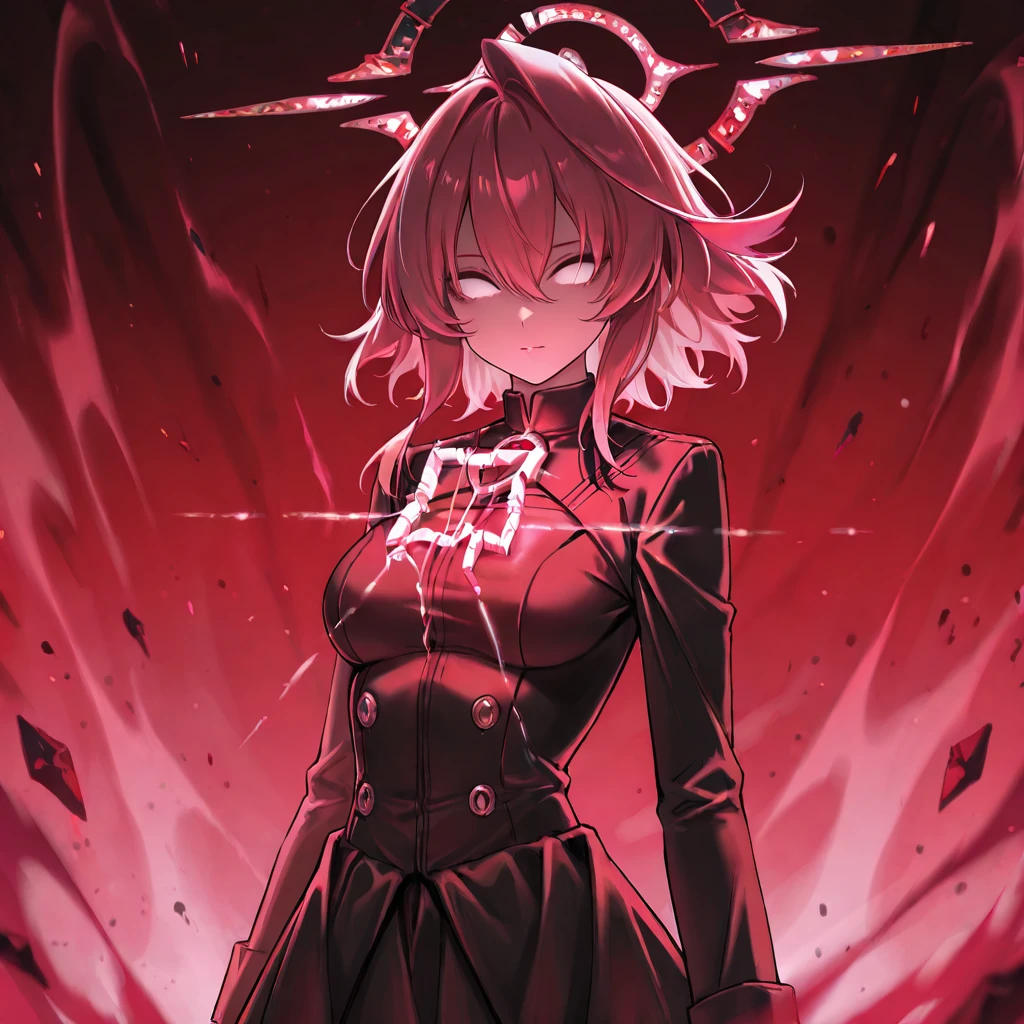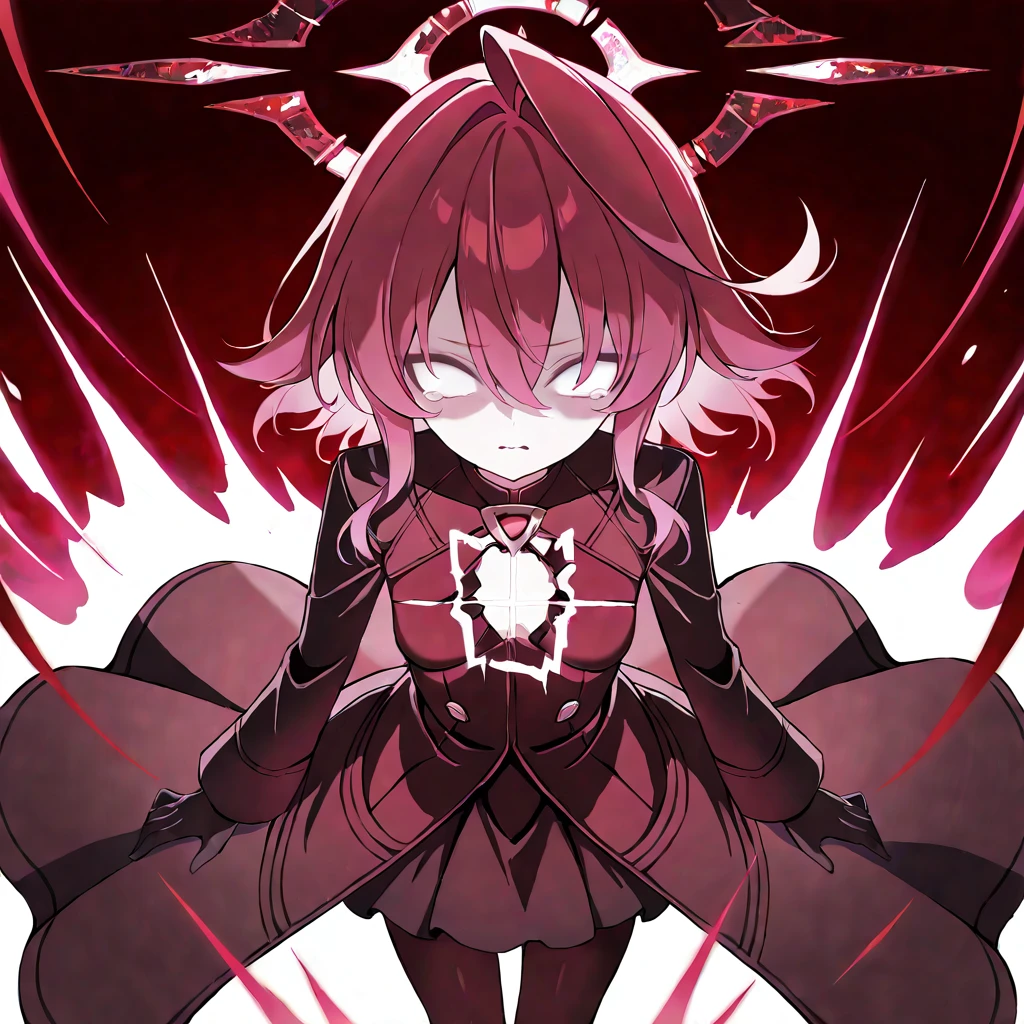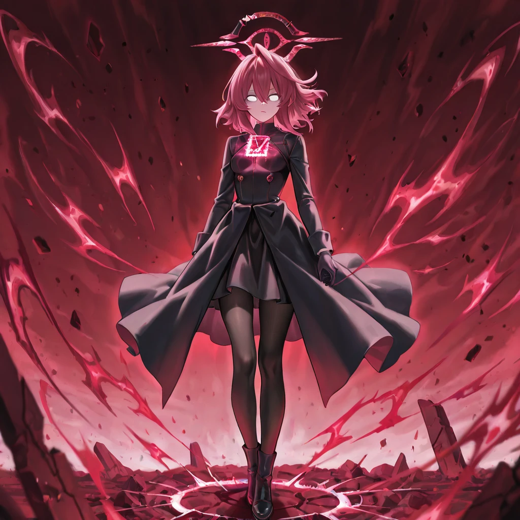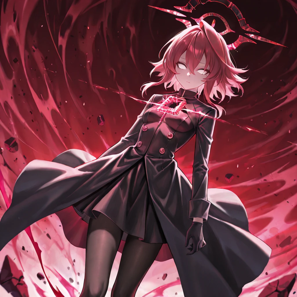 hoshino_terror,1girl,pink hair,red hair,hair between eyes,medium hair,white eyes,no pupils,tears,broken halo,red halo,red theme,aura,light on chest,black gloves,black coat,black pantyhose,black skirt,black footwear,small breasts,