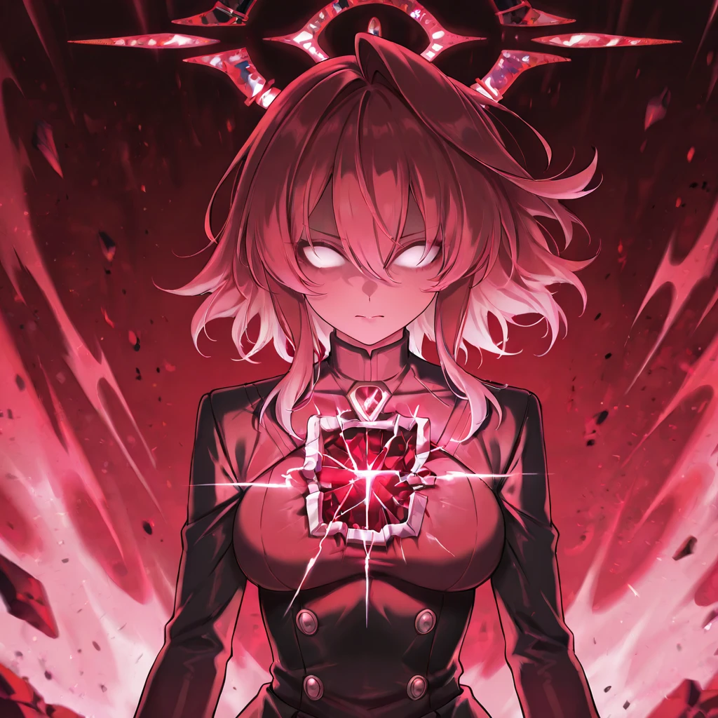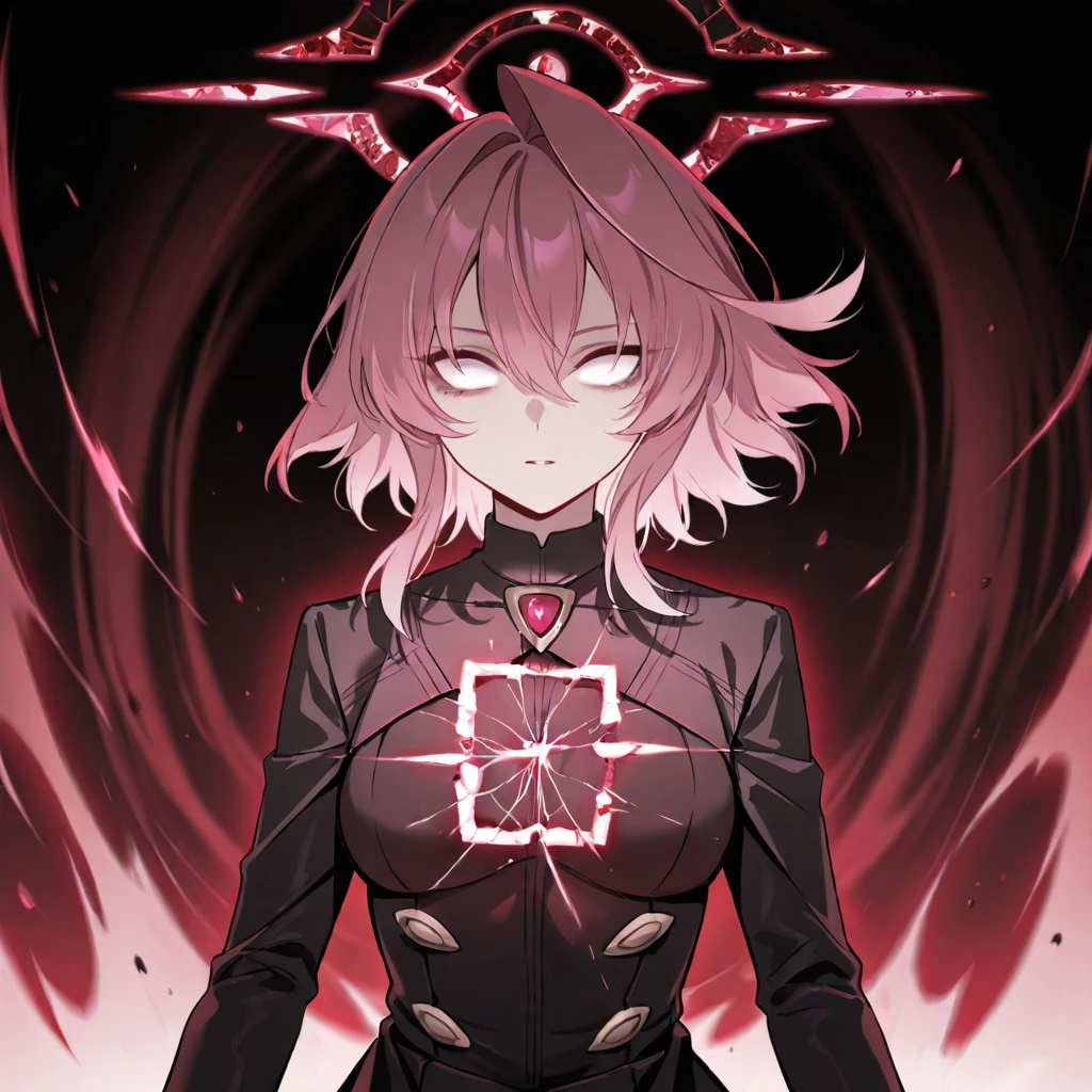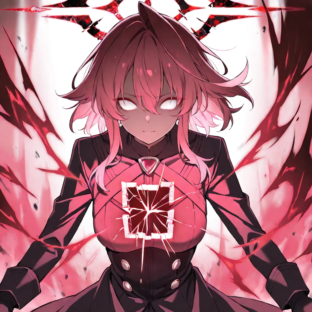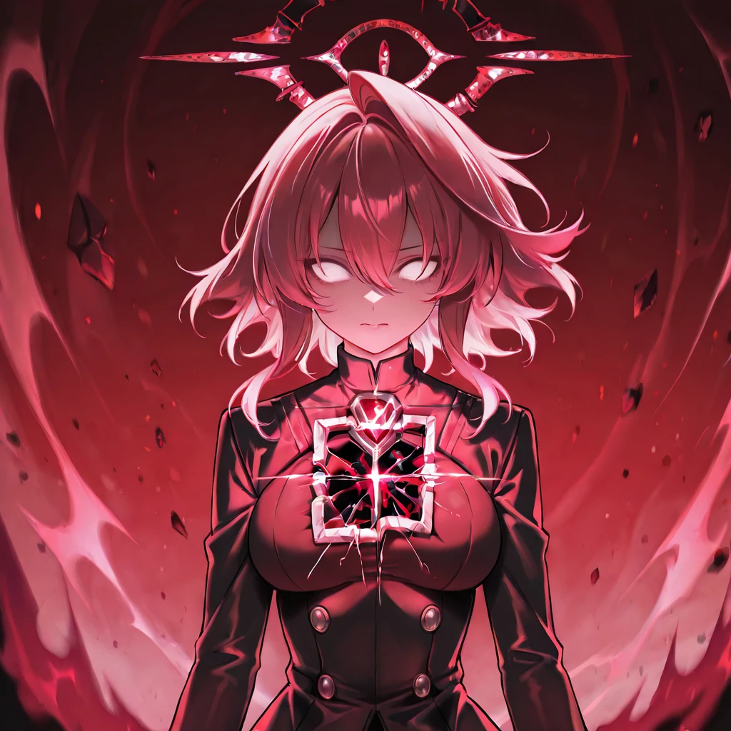 hoshino_terror,1girl,pink hair,red hair,hair between eyes,medium hair,white eyes,no pupils,tears,broken halo,red halo,red theme,aura,light on chest,black gloves,black coat,black pantyhose,black skirt,black footwear,small breasts,