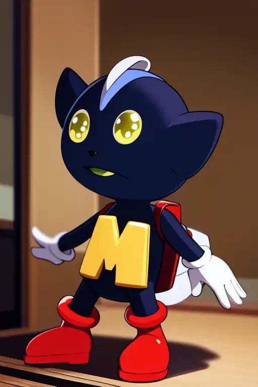 Prompt: Bokkun, dark blue skin, round yellow eyes, jetpack, white gloves, a belt with a large yellow "M" in the middle, red boots