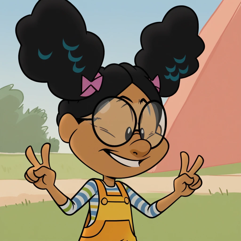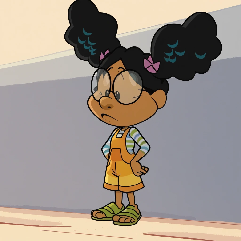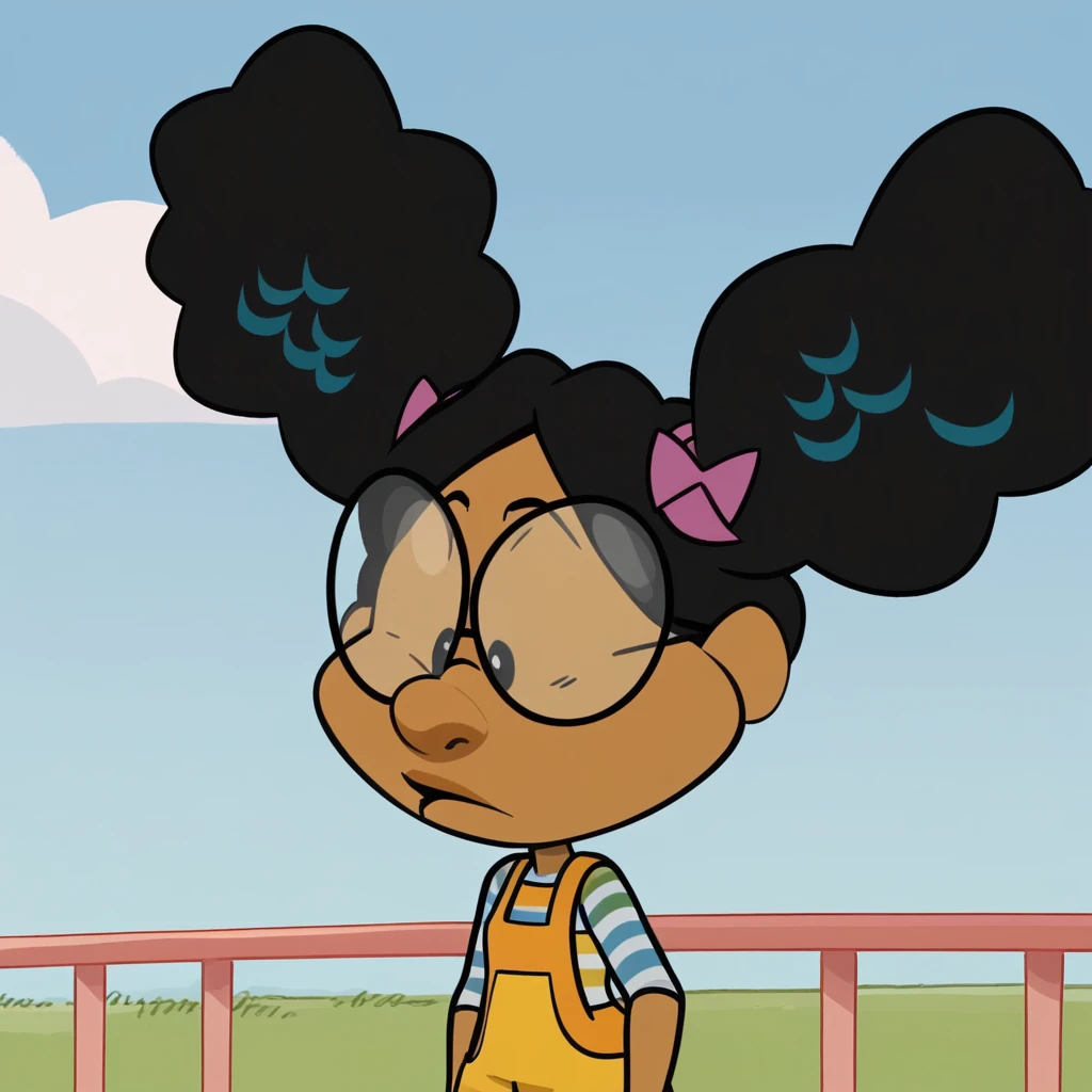 Lili, 1girl, solo, black hair, afro, hair bow, black eyes, glasses,